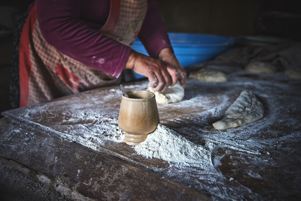 Dopo la visita alla cantina, dove le qvevri sono al lavoro sepolte sotto terra e gli attrezzi sono gli stessi di quelli di secoli fa, Shota ci invita alla sua tavola. La grande tavola di legno viene imbandita con diversi piatti di portata, tutte pietanze tipiche, fatte in casa con ingredienti naturali. C’è la tradizionale insalata di pomodori e cetrioli; ci sono formaggi straordinari: l’imeruli, un formaggio fresco e lattiginoso della regione di Imereti, e il gouda, un formaggio stagionato o semi-stagionato di pecora tipico di Tusheti; c’è il pane a forma di barca, lo Shotis puri, fatto nel tipico tone, forno di argilla; c’è pane anche per i celiaci, l’ottimo mchadi, fatto interamente di farina di mais; ci sono gli pkhali, dei companatici nel vero senso della parola, che comprendono diversi tipi di paté vegetali e il nadughi insaporito con mentuccia ed erba cipollina; ci sono gli mtsvadi, tocchetti di carne arrostiti alla brace; c’è il chashushuli, una particolare ricetta di carne in umido (tradizionalmente agnello, ma spesso manzo o addirittura coniglio)… e c’è il vino, un sacco di vino.