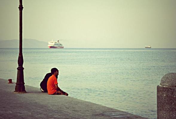 Il primo dei migranti con cui ho parlato, uno dei tanti siriani in fuga dallo sfacelo del suo paese, mi ha detto che, essendo un campione di nuoto, se non fosse stato per i suoi parenti quei chilometri li avrebbe traversati a bracciate. E invece no: ci hanno provato ben cinque volte, lui e i suoi, a salpare, dopo aver consegnato mille euro a testa agli ‘scafisti’, e una gli è andata talmente male che sono caduti in mare, salvandosi per un pelo. E tuttavia per attraversare questo piccolo tratto non occorro grandi imbarcazioni, le famigerate ‘carrette’ del mare che mirano alle coste sicule o calabre. Qui basta un gommone: come quello, appena abbandonato e senza più motore (forse asportato dagli accompagnatori in prossimità della riva: perché costa) che ho trovato un mattino presto davanti agli ombrelloni, nella spiaggia ancora semideserta. Nero e mezzo sgonfio, sembrava un grosso cetaceo spiaggiato e abbandonato al suo destino. Dei passeggeri neppure l’ombra: gli addetti allo stabilimento lo hanno rimosso prima che arrivassero i clienti.