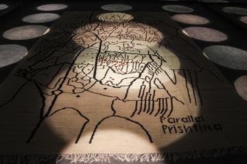 Sul pavimento, il padiglione presenta un unico elemento centrale, un tappeto tradizionale del “Parallel Prishtina” tessuto da una donna della regione di Has. Il tappeto, che rappresenta una mappa di Pristina, rappresenta in nero le strade e gli uffici delle istituzioni pubbliche da cui gli albanesi sono stati espulsi. In rosso sono invece rappresentati i punti in cui le lezioni universitarie sono state smistate in case private per continuare a tenerle. Il contrasto di colori dimostra la separazione della città presente all’epoca. Al centro un mare di nero, mentre nelle zone attorno ai quartieri suburbani come Ulpiana e Arberia, moltissimi puntini rossi.