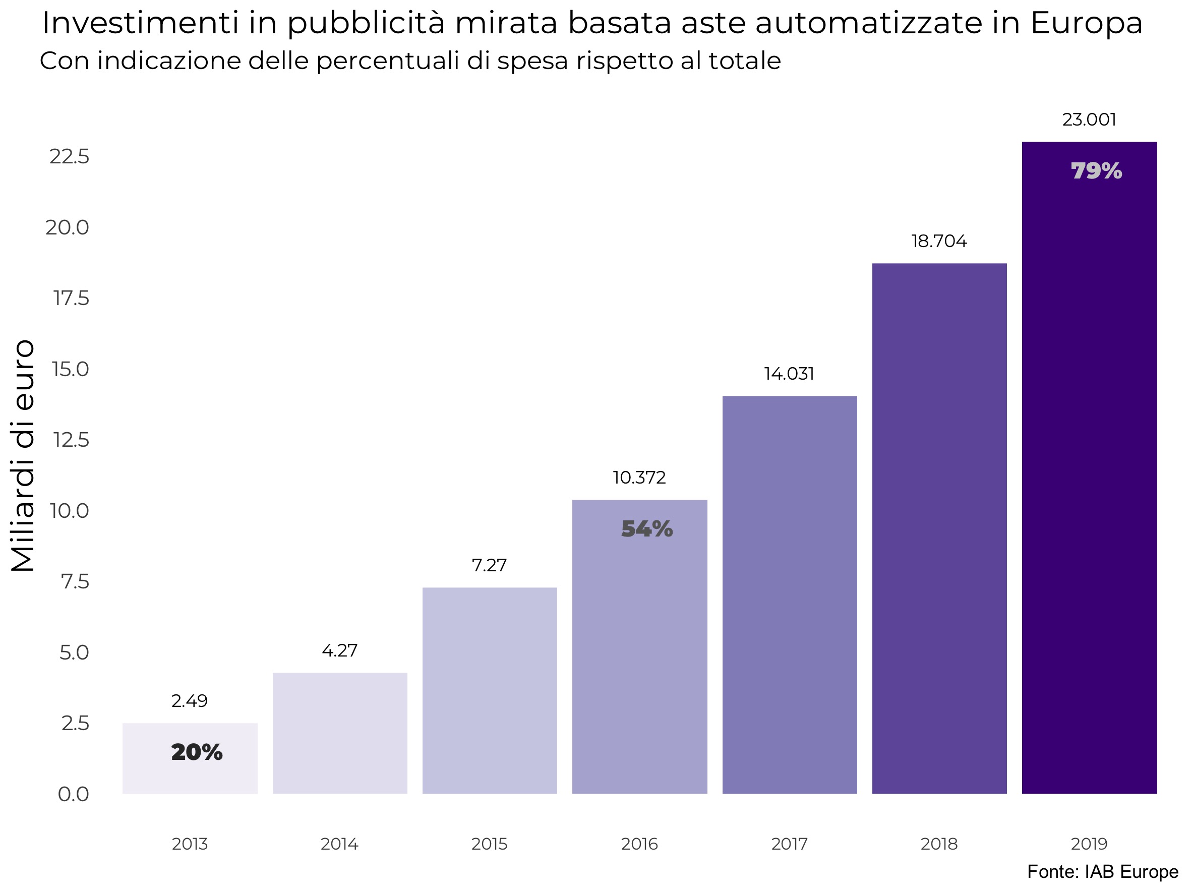 La pubblicità mirata si basa invece su un sistema più complesso, finalizzato a mostrare l’annuncio più pertinente rispetto al profilo dell’utente che sta visualizzando una certa pagina. Il sistema più sofisticato e diffuso oggi è quello delle aste automatizzate. Durante il caricamento della pagina, un identificativo che permette di associare un utente alla sua attività online (e talvolta offline) viene inviato a una serie di agenzie che competono in un’asta istantanea al fine di mostrargli l’annuncio più pertinente per il suo profilo. Il tutto in poche frazioni di secondo e senza che l’utente si accorga di nulla.