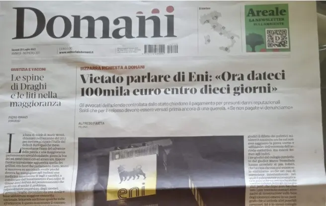 Il 28 luglio l’edizione online del quotidiano Domani ha informato i propri lettori di aver ricevuto una lettera dall’ENI in cui l’azienda lamentava presunti danni reputazionali da un articolo pubblicato dal quotidiano e chiedeva il pagamento di 100mila euro entro 10 giorni, altrimenti avrebbe sporto querela.