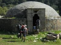 Gokceoren è un altro di questi posti. Non è segnalato nemmeno sulle carte e solo la curiosità di esplorare una cavità che segna il fianco di una collina che ci fa partire dall’omonimo villaggio, un piccolo insediamento di pastori e contadini, con le case sparse in un’ampia vallata e un vecchissimo platano, gokceoren appunto, accanto ad una moschea bianca. Ci andiamo di notte, alla luce delle torce, per un sentiero da capre aperto da poco nell’intricatissima macchia bassa fatta da querce spinose e stracciabrache. All’improvviso una serie di pietre che sembrano squadrate e messe con proposito in linea retta, ci fanno capire che su questa collina, un tempo…millenni… ere…eoni fa, c’era qualcosa. Sotto una pietra spiovente si trova la prima tomba rupestre, intagliata nella dura roccia calcarea, sembra scalpellata da poco. Assomiglia al disegno di una casa fatta da un bambino: la porta rettangolare e il tetto da cui fuoriescono l’estremità delle travi di legno. L’interno e vuoto, depredato chissà quanto tempo fa, ma pulito, anche da animali e insetti che forse sentono la sacralità del luogo. La cima di una collina vicina è stata livellata, da una parte scalpellando la roccia viva, dall’altra riportando delle grosse pietre, per farne una specie di pedana che poteva fungere da osservatorio. Ci mettiamo distesi ad osservare il cielo nero, solcato dalle gocce di latte cadute ad Era quando cercò di allattare Eracle, a contemplare lo stesso spettacolo che guardavano le sentinelle licie.