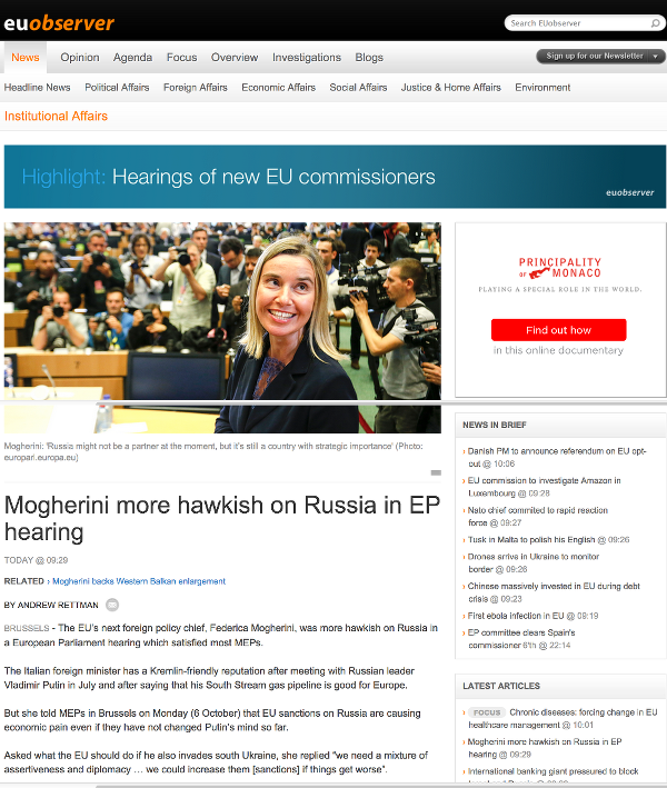 Anche il portale EuObserver ha riportato dell’”atmosfera positiva” che accolto l’audizione della Mogherini presso la commissione Esteri del Pe. Il sito sottolinea l’atteggiamento più duro nei confronti della Russia rispetto ad un attitudine in passato ritenuta piuttosto “Moscow-friendly” e che aveva disturbato molti al momento della sua nomina alla carica di Lady PESC. “La Russia non può essere un partner al momento, ma resta un paese di importanza strategica negli affari mondiali, e quindi credo che sarà necessario rivalutare profondamente le relazioni dell’Ue con la Russia nei prossimi cinque anni”, ha sottolineato Federica Mogherini.