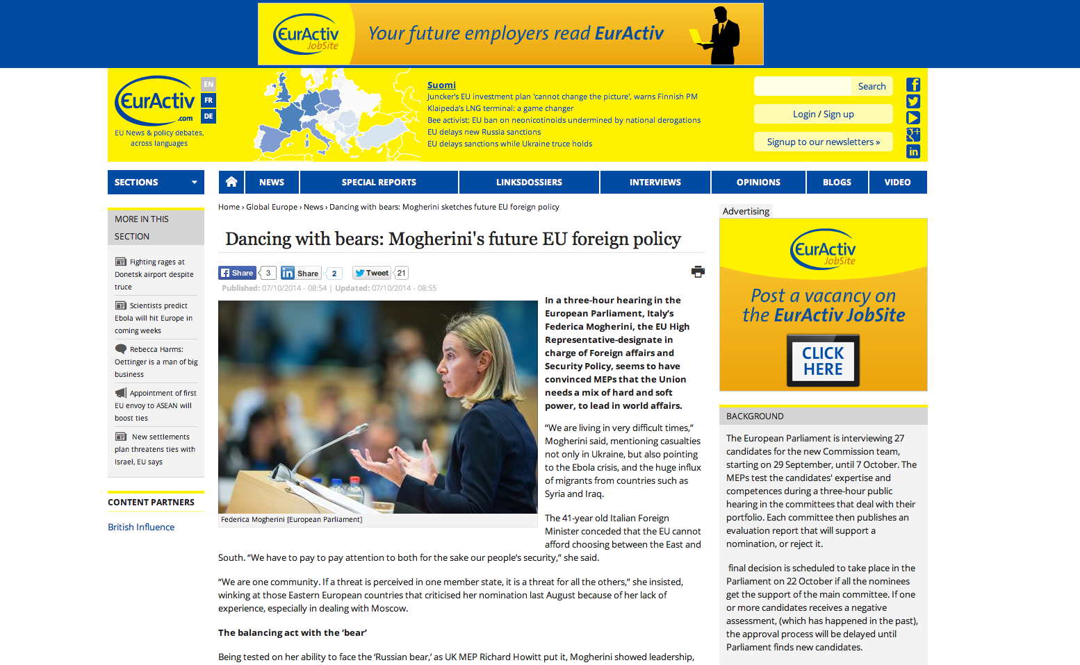 Il sito specializzato di questioni europee Euractive.com esprime un giudizio positivo sull’audizione della Mogherini e in particolare si sofferma sulla questione dei rapporti tra Ue e Russia. "Nelle tre ore di audizione presso il Parlamento europeo la Mogherini sembra essere riuscita a convincere gli eurodeputati che l’Unione necessita di un mix di soft power e assertività per guidare i fenomeni globali".