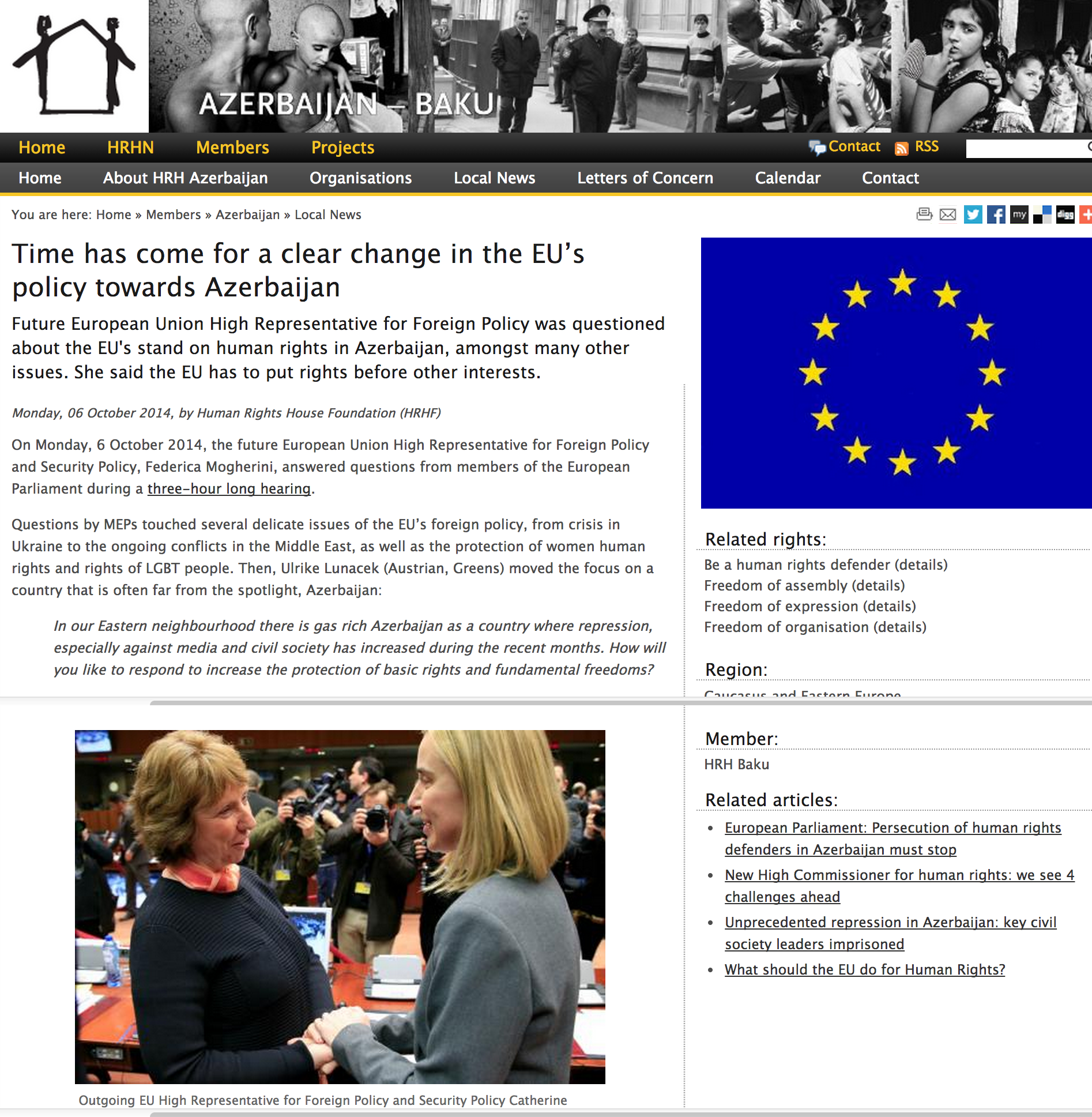 "E’ il momento per l’Ue di cambiare politica nei confronti dell’Azerbaijan”, titola Human Rights House (HRHF), ONG per la difesa dei diritti umani. Il portale si è soffermato sulle parole della Mogherini sul tema dei diritti fondamentali e delle libertà civili. La Mogherini ha risposto che l’Ue deve essere più esigente in materia di rispetto dei diritti umani, anche con partner economici importanti come l’Azerbaijan. “La questione dei rapporti dell’Ue con l’Azerbaijan non è facile. Stiamo investendo molto in Azerbaijan per l’energia e quel paese è diventato importante la diversificazione energetica dell’Ue. E proprio in virtù di queste relazioni credo sia necessario sottolineare, con ancora più forza, l’importanza del rispetto dei diritti umani, soprattutto nel campo dei media e dell’attivismo politico”, ha spiegato la Mogherini. Secondo Florian Irminger di HRHF, il tema dei prigionieri politici azeri è finalmente arrivato alle orecchie dei politici di Bruxelles.