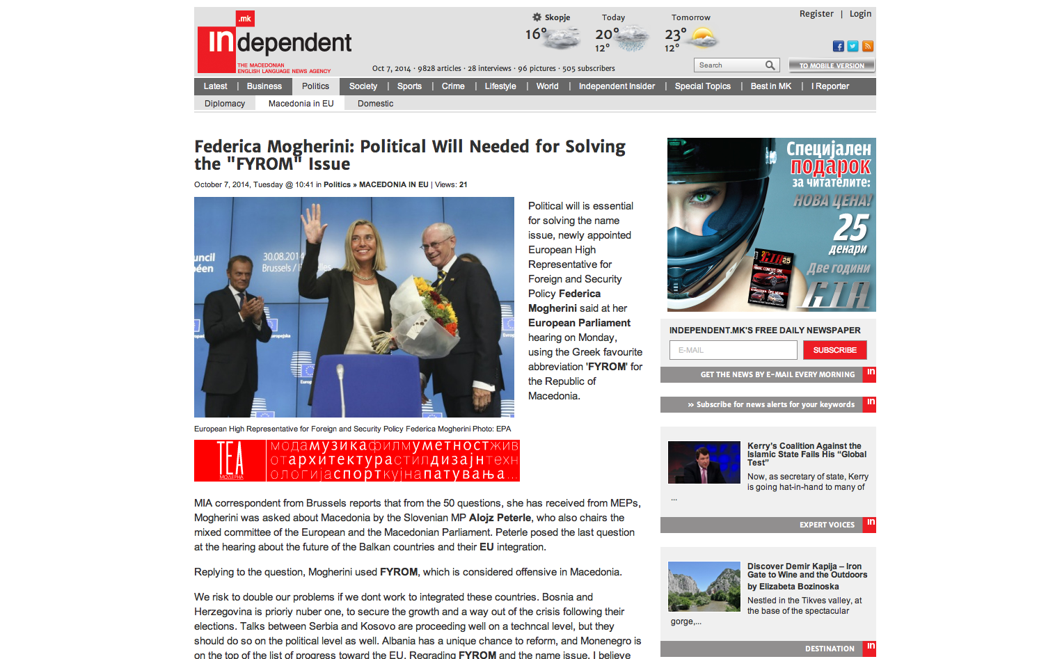 L’agenzia stampa macedone Independent.mk si sofferma sulla risposta data da Federica Mogherini ad una domanda relativa al processo di allargamento posta dal deputato sloveno Alojz Peterle. L’agenzia stampa macedone sottolinea poi nello specifico che la Mogherini ha utilizzato per designare la Macedonia il termine "FYROM, preferito dai greci" e poi viene sottolineato come, proprio sulla questione del nome "occorra trovare una volontà politica per risolverla".