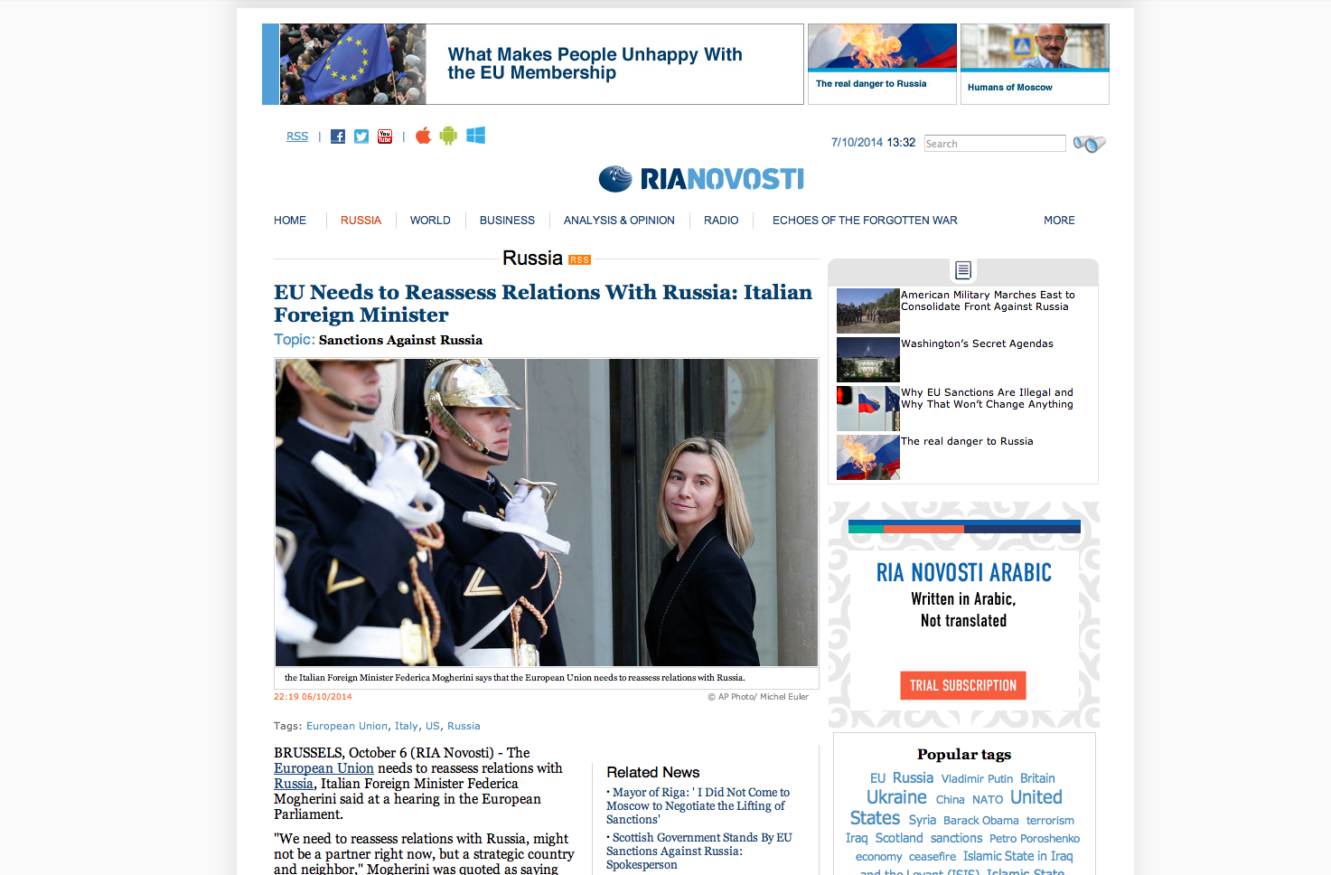 L’agenzia di stampa russa RIA Novosti dedica la sua attenzione alle dichiarazioni relative ai rapporti tra Ue e Russia. Si sottolinea l’affermazione della Mogherini secondo la quale la Russia non sarebbe più attualmente un "partner strategico dell’Ue" ma resta comunque un paese strategico e vicino con cui occorre avere a che fare. In merito alle sanzioni imposte dall’Ue la Mogherini durante l’audizione ha affermato che queste ultime si sono rivelate efficaci dal punto di vista economico mentre l’agenzia russa preferisce sottolineare come "le sanzioni, in particolare concentrate sul sistema bancario, quello dell’energia e quello militare, sono considerate inopportune da molti analisti politici, dato che non corrispondono alla volontà di trovare una soluzione pacifica al conflitto ucraino e sono svantaggiose dal punto di vista economico per molti paesi europei".