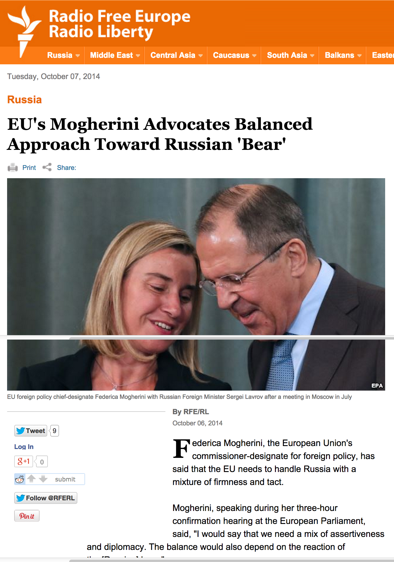 “Un approccio bilanciato nei confronti dell ‘orso russo’”. Così titola RadioFree Europe, rivolgendo anche in questo caso l’attenzione ai rapporti UE-Russia, da gestire con un “mix di assertività e diplomazia”, secondo le parole della Mogherini. “Il bilanciamento dipenderà anche dalla reazione dell’orso russo”, ha detto la Mogherini, riprendendo l’espressione usata da un eurodeputato. Soffermandosi sull’importanza per l’UE del Partenariato orientale, la futura Lady PESC ha sottolineato il fermo sostegno dell’Unione all’Ucraina, “in termini di sicurezza, riforme istituzionali, e sostenibilità del processo politico”. Inoltre, ad una domanda sull’efficacia delle sanzioni ha risposto: “L’economia russa sta iniziando a soffrire come conseguenza delle sanzioni. Dunque, se la domanda è se le scelte fatte fino ad ora nei confronti della Russia sono state corrette, la risposta è sì”.
