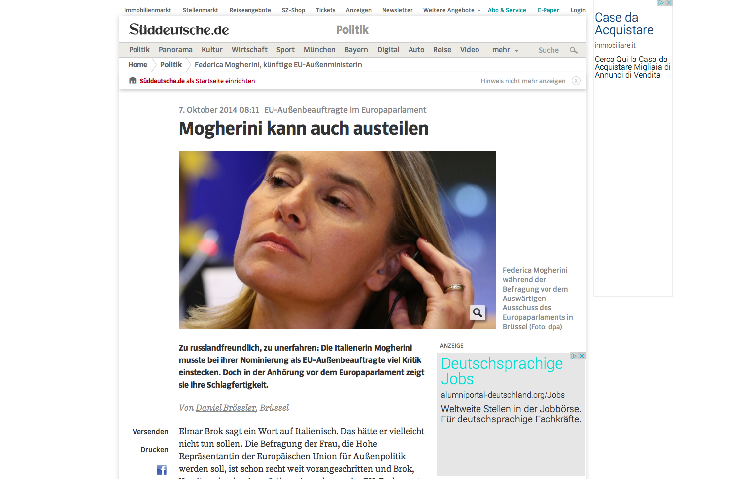 "Troppo vicina alla Russia, troppo inesperta: l’italiana Mogherini ha dovuto sopportare molte critiche da quando è stata nominata responsabile in pectore della Politica estera Ue. Ma all’audizione presso l’Europarlamento ha dimostrato la sua prontezza". Queste le prime righe di un pezzo pubblicato dal quotidiano tedesco Süddeutsche Zeitung.