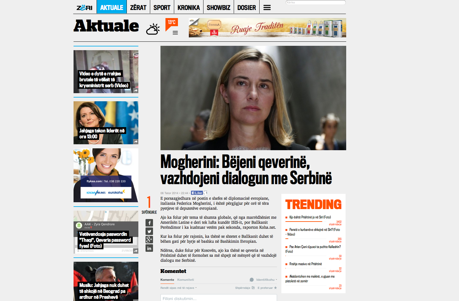 Il quotidiano albanese Zeri si sofferma sul fatto che ai Balcani sono stati dedicati solo pochi secondi dell’audizione. Poi un tema che riguarda nello specifico la comunità albanese dei Balcani: "Parlando del Kosovo la Mogherini ha affermato che si deve al più presto formare un governo e continuare il dialogo con la Serbia".