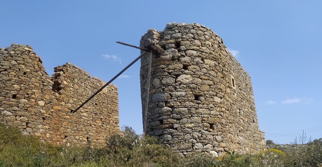 Nel pomeriggio risalgo in sella per andare a Vrouchas, sul crinale del promontorio che chiude il golfo a nord. Poco prima del villaggio c’è una spettacolare infilata di ruderi. Una dozzina di mulini a vento, quasi tutti diruti. Alcuni hanno ancora i pennoni che portavano le pale. Entro in uno di questi e rimango lì incantato ad osservare il cuore di queste creature donchisciottesche. Ingranaggi di legno su basamenti di pietra e su tutto polvere, polvere, polvere. Polvere portata dal vento e dal tempo.