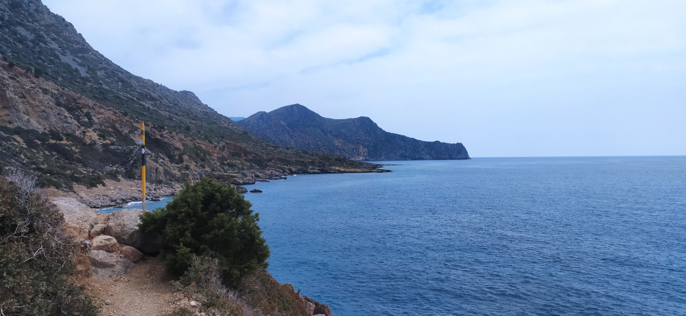 La Grecia, compresa Creta, non è più economica! I prezzi sono cresciuti molto negli ultimi anni e in taverna sono quasi quelli della provincia italiana. Ieri sera a Paleochora, una birra costava 4 euro, un piatto d’erbe (di montagna, buonissime) 6 euro, un piatto di polpo arrosto (scarso!) 14 euro. Prezzi allineati anche per gli alimentari. Questa mattina a Paleochora: latte a 2 euro al litro, pane a 5 euro al chilo, frutta e verdura a 2-3 euro al chilo. Immagino che comunque la gente si arrangi, che il riscaldamento sia un lusso a cui rinunciare, che il sole, il mare, la montagna rimangano gli svaghi più popolari, oltre all’irrinunciabile caffè, qualche sigaretta, la musica, le chiacchiere, gli amori. “Mi fermerò qui. Ad ammirare un po’ la natura. / Mare al mattino, cielo senza nubi / d’un viola splendido, la riva gialla: tutto / grande e bello, fulgido nella luce”. Ecco la luce! La luce di Creta, della Grecia, del Mediterraneo, quella cantata da Kavafis, quella che riempie gratuitamente ed eternamente l’anima dei greci e di chi come me adesso va errabondo sulle strade, sui sentieri, sulle rive di un mare assoluto. Quello che ho alla mia destra e diventa sempre più assoluto, mano a mano che il sentiero sale.