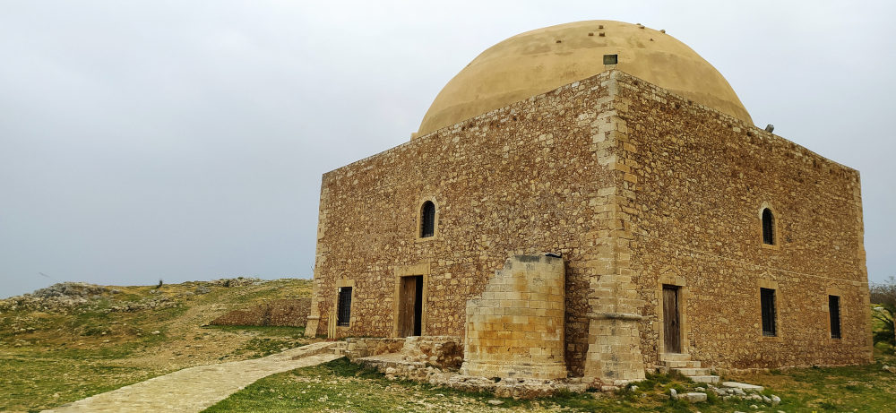 Libeccio raffica selvaggio! Spirito ottomano che ritorna sulla Fortezza che conquistarono nel 1646 dopo feroci anni d’assedio, scrivo sul taccuino. Un Libeccio furioso che mi ha costretto a muovermi da un punto all’altro della fortezza camminando dove possibile radente ai muri nel sottovento, che mi ha fatto rifugiare dentro alla moschea sconsacrata, un tempo dedicata al sultano Ibrahin Khan. Costruita sulle fondamenta di quella che era stata per secoli la Cattedrale di San Nicola, al centro delle mura stellate. Costruita nella seconda metà del XV secolo dai veneziani, che già dominavano Creta da più di tre secoli, sulla collina di Paleokastro, in posizione dominante sulla rada portuale a est. Un governo che si faceva sempre più difficile, sottoposto alla pressione e alle scorrerie della pirateria turca che assalì e depredò la città nel 1571. Ciò che rimane della moschea sono gli spogli muri perimetrali, un cubo di pietra color sabbia sormontato da una grande cupola. Del minareto, in pietra bianca, rimane solo il basamento a destra dell’ingresso. Non una torre che sale nelle luci celesti, ma un pozzo che scende nelle ombre sotterranee. L’ambiente interno della ex-moschea, a pianta quadrata, è completamente spoglio. Degli antichi decori rimangono solo tracce di quelli del miḥrāb, la nicchia che indica al fedele la direzione della Mecca e della Kaʿba.