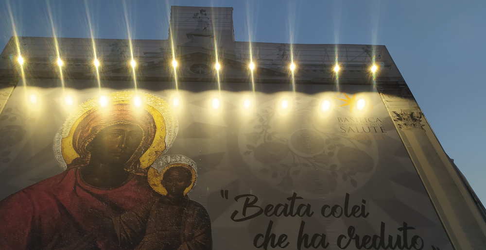 Io sono ritornato da Lei qualche giorno dopo, quando il ponte votivo sul Canal Grande era già stato smantellato e non c’erano più bancarelle, candele, palloncini, cerimonie. Rimanevano però i paramenti festivi della chiesa e la gigantesca immagine che da mesi, da quando sono partiti i lavori di ristrutturazione, troneggia sulla facciata della Basilica. Un’immagine ultra-pop, una Mesopanditissa, una mega-icona alla maniera di Andy Warhol. Dentro alla basilica, nei maestosi spazi barocchi disegnati da Baldassare Longhena nel Seicento, c’era ancora odore d’incenso e candele, qualche fedele in preghiera, un prete che riordinava i fiori sotto all’altare maggiore.