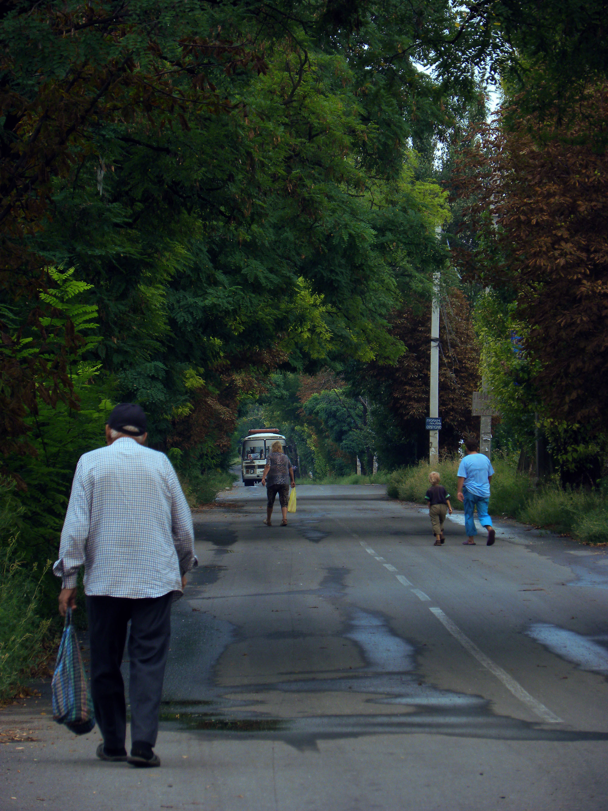 Nonostante l’inferno della guerra a pochi chilometri di distanza, il mercato di Donetsk brulica di persone indaffarate. Chi carica, chi scarica, chi vende, chi compra. Appena fuori, in un bellissimo parco c’è chi va in bicicletta, chi si allena, chi prende il sole. Nel centro della città incrociamo comitive di adolescenti, bellissime ragazze ed alcune babushke – in russo: nonne, anziane signore – che portano a spasso i propri nipoti.