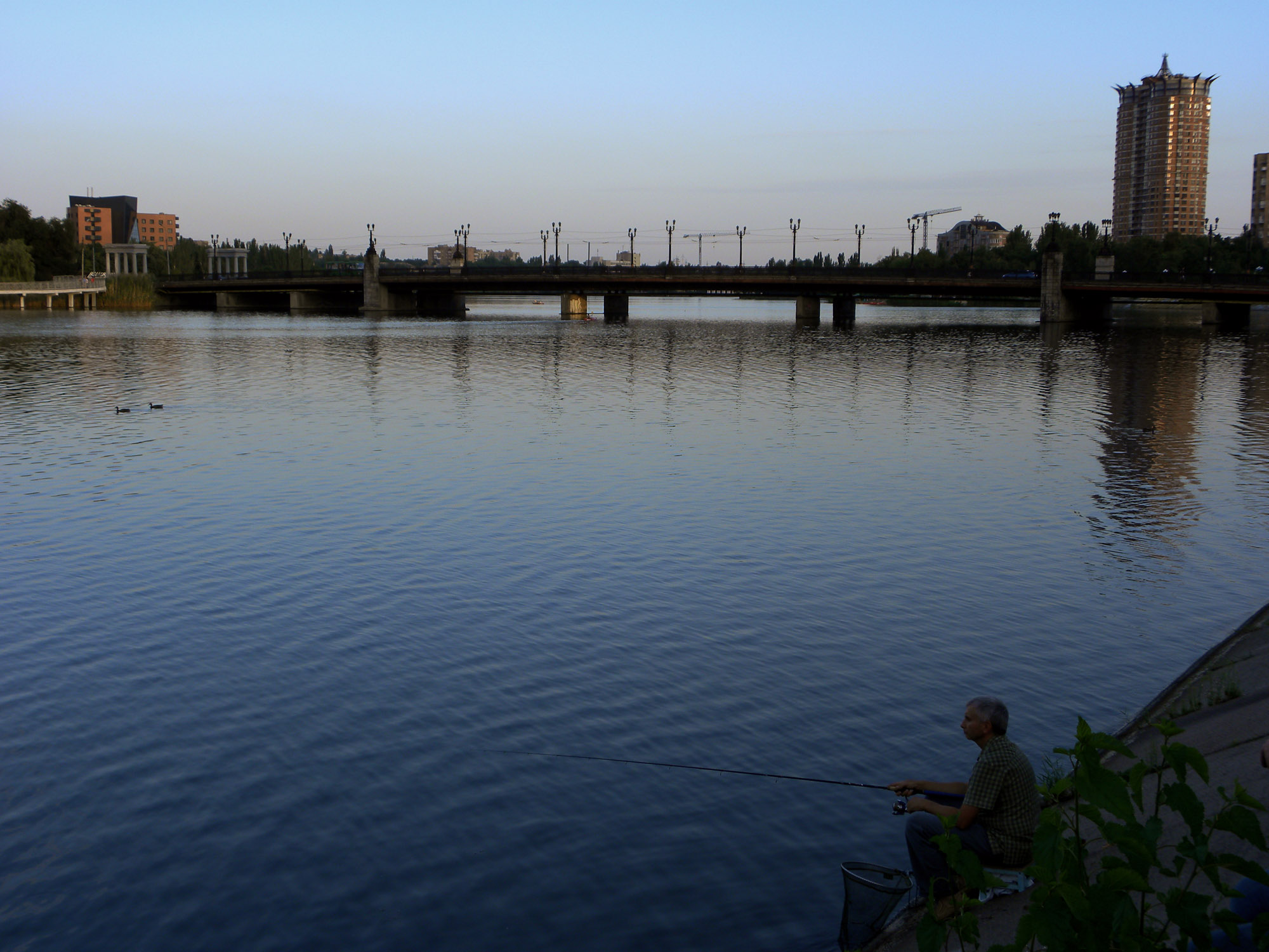 (Nella foto: Al tramonto, un pescatore sul fiume Kalmius, a ridosso del centro città)
