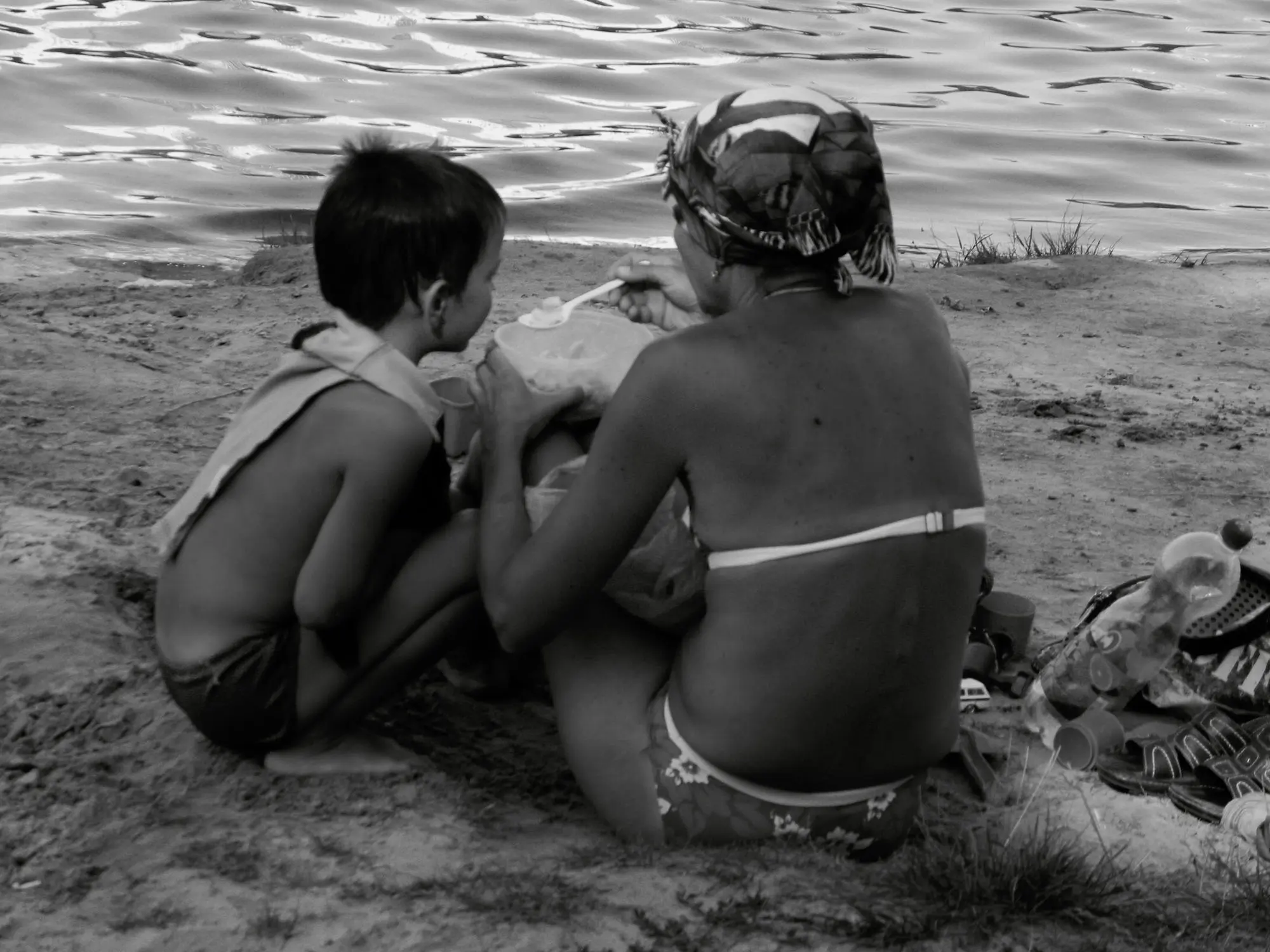 (Nella foto: La merenda di un bimbo sulla spiaggia del fiume)