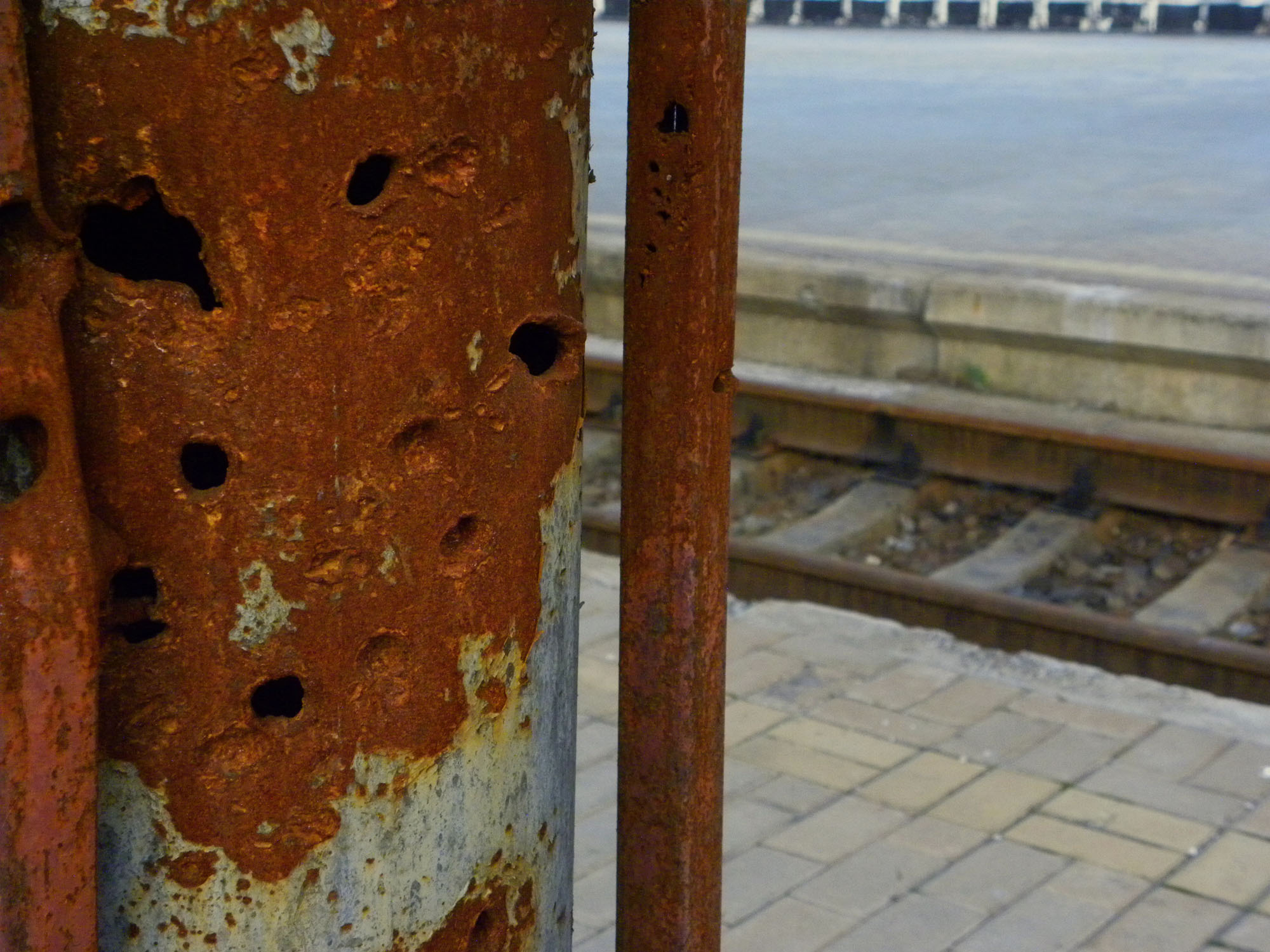 (Nella foto: Una colonna della banchina crivellata di colpi)