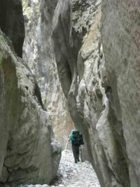Il giorno dopo, sconfitto nel tentativo di salire sulla cima dalla troppa neve, continuo a girare intorno alla montagna fino a scendere nelle gole di Viros, del tutto simili a quelle che aveva percorso Patrick e solo di qualche chilometro più a sud. Il sentiero, una volta percorso da carovane di muli che portavano sale e pesce secco all’interno e pelli conciate e formaggio sulla costa, e dai pastori transumanti, oggi è quasi impercorribile e difficilmente potrò incontrare una famiglia di pecorai intenti a cuocere in grandi paioli il latte lungo la gola, come ci racconta nel libro. E’ solo nel tardo pomeriggio che la gola si allarga, vicino a un piccolo abitato e una chiesa, quasi nascoste da una macchia che ha ripreso i campi strappati con tanta fatica dai contadini greci nel corso di secoli, per poi restringersi di nuovo poco prima di arrivare al villaggio di Chora, finalmente abitato, dove si svolge la stessa scena descritta da Patrick al termine della sua traversata; “da dove vieni?”, mi domandano ad un alberghetto in cui stanno facendo una festa locale, vedendomi con un grosso zaino sulle spalle, “da Mystras!” , gli rispondo con soddisfazione, “da Mystras?” mi rispondono con incredulità, “Sarai morto, quelle rocce da capre ammazzerebbero chiunque. Sono una disperazione, ti fanno sputare l’anima!”