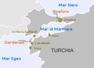 Per ritrovare il suo fantasma dobbiamo spingere lo sguardo, sempre lungo questo mare, sulla slanciata e sottile penisola che pare contenerlo da nord quando fluisce nell’Egeo. Gallipoli (Gelibolu, in turco), vista dall’aereo pare un collo di cigno proteso in volo, che spinga lo sguardo fino a scrutare l’altro mare. È tanto ricca di memorie, di bellezze e di storie che da sola merita – lo vedremo – un viaggio a sé: ad onta del fatto che questo sia un ‘piccolo’ mare.