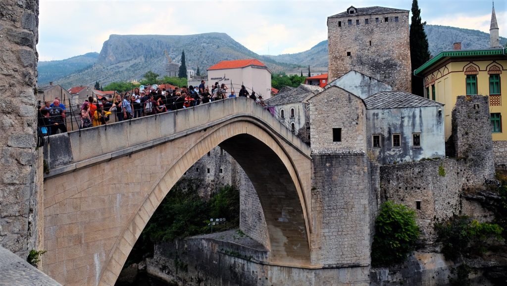 Il Vecchio (così è chiamato il ponte) è stato riedificato nel 2004. La patina assunta nei secoli è andata perduta e la sua schiena d’asino non è carica della stessa densità di storie, leggende e memorie. L’eredità della guerra però rimane, pesante e talvolta soffocante. Benché senza armi, il conflitto tra croati e bosniaci musulmani continua ancora dopo 25 anni tramite la segregazione e la divisione politica, rese evidenti dalla creazione di servizi pubblici duplicati e differenziati per le due comunità, come poste, scuole, servizi commerciali, pompieri e ospedali.