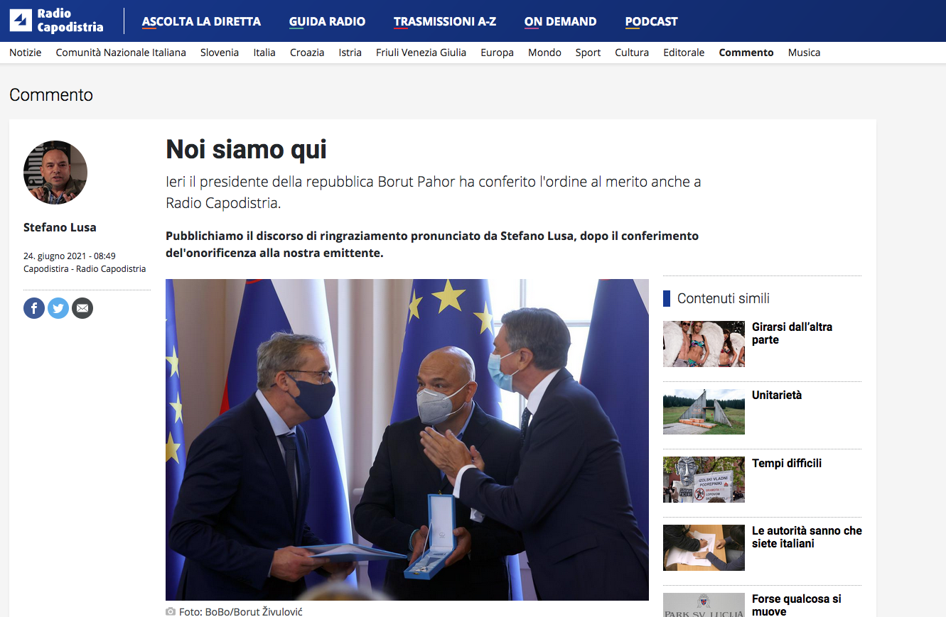 Ieri il presidente della repubblica della Slovenia, Borut Pahor, ha conferito un’alta onorificenza a Radio Capodistria. Pubblichiamo il testo del discorso tenuto in occasione da chi, quel premio, l’ha ritirato: Stefano Lusa, caporedattore di Radio Capodistria e corrispondente di OBCT