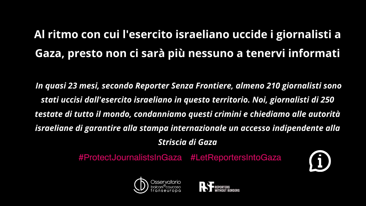 L’1 settembre anche OBCT ha aderito alla campagna di Reporter senza frontiere e Avaaz che condanna le uccisioni dei giornalisti a Gaza, chiede tutela per i giornalisti palestinesi e l’ingresso dei giornalisti internazionali. Il mondo ha bisogno di testimoni dei crimini contro l’umanità che il governo israeliano sta commettendo a Gaza e nel territorio palestinese occupato