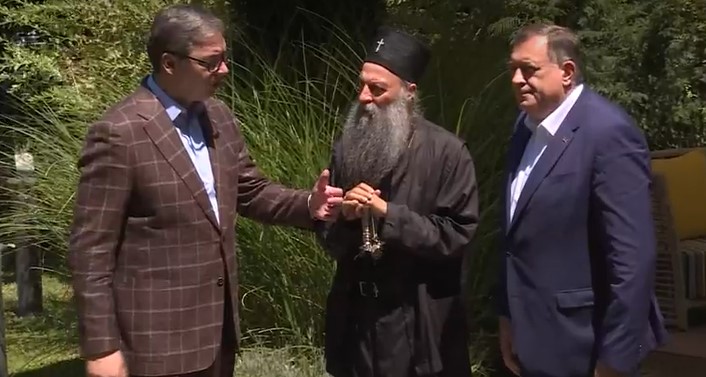 Aleksandar Vučić, Milorad Dodik e il patriarca Porfirije (screenshot youtube)