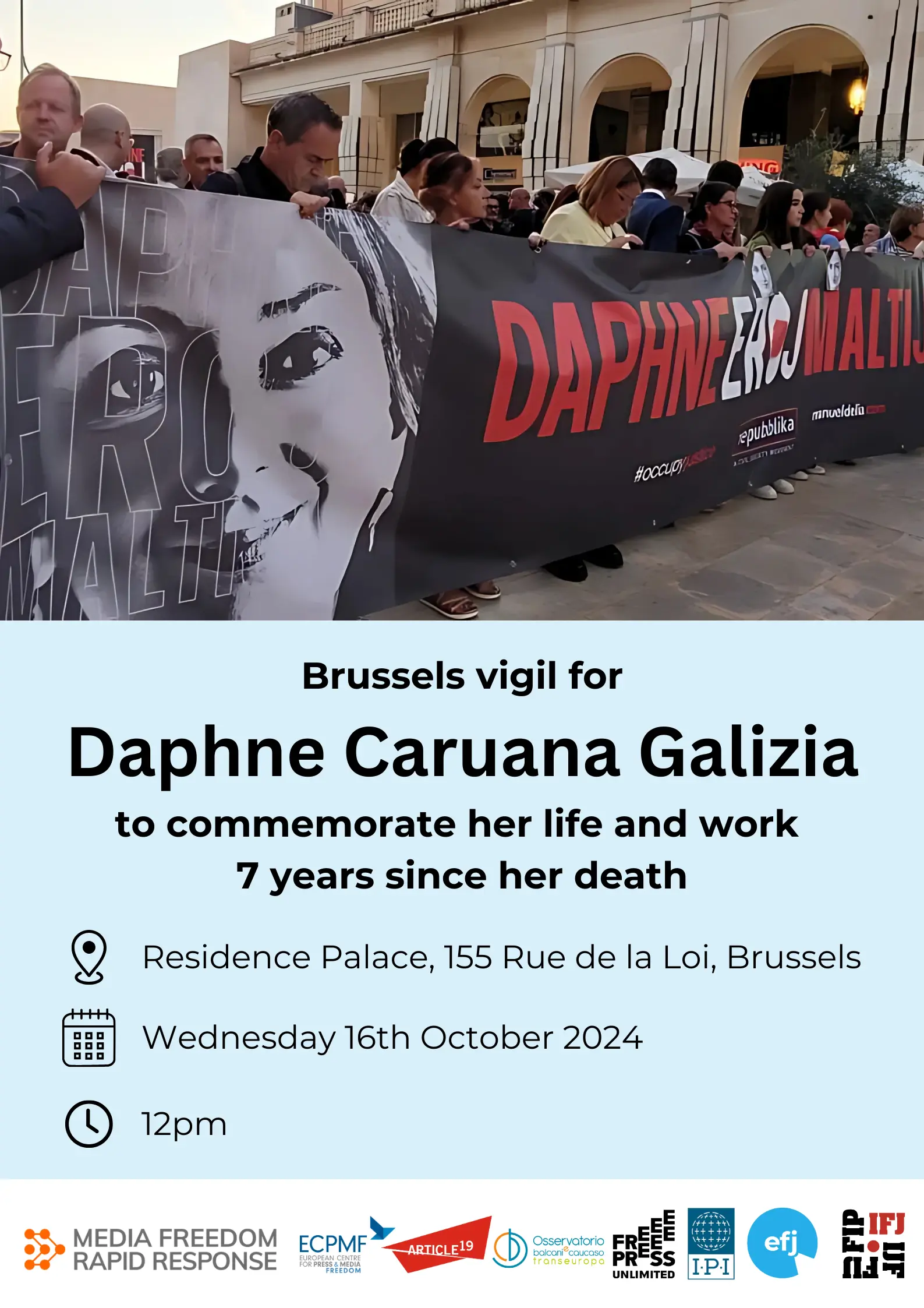 Il 16 ottobre alle 12:00 davanti al Residence Palais di Bruxelles, sette anni dopo la tragica morte della giornalista investigativa maltese Daphne Caruana Galizia, i partner del Media Freedom Rapid Response, giornalisti e rappresentanti della comunità della libertà dei media si riuniranno per commemorare il suo lavoro e la sua dedizione