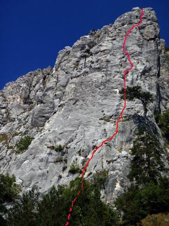 La via, oltre alle vecchie protezioni, è stata recentemente protetta con spit, sia lungo la via che alle soste, e le calate sono state attrezzate. Si arrampica su calcare, per lo più di buona qualità, anche se a volte un po’ sporco. Raggiunta la cima, si ha la sensazione di trovarsi su un balcone sospeso sopra la foresta circostante e protetto dal massiccio roccioso alle spalle. Un’esperienza unica.