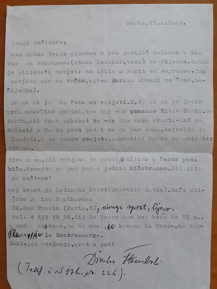 L’ultima sera del nostro soggiorno a Parigi ci ritrovammo a cena a casa di Dinko e Mira, nel Quartiere latino. Nel corso della serata Dinko mi mostrò uno dei suoi minuscoli taccuini su cui, sin dal suo arrivo a Parigi, in quel lontano 1946, scriveva il suo Diario (un libro che non è mai uscito nella sua interezza; ad oggi sono stati pubblicati solo alcuni frammenti “per colpa” di un cugino di Dinko, Nikola Štambak, e del sottoscritto. Oggi i taccuini, in tutto ottanta, che compongono il Diario sono custoditi al museo di Imotski).