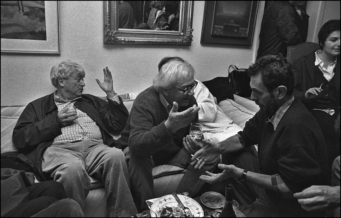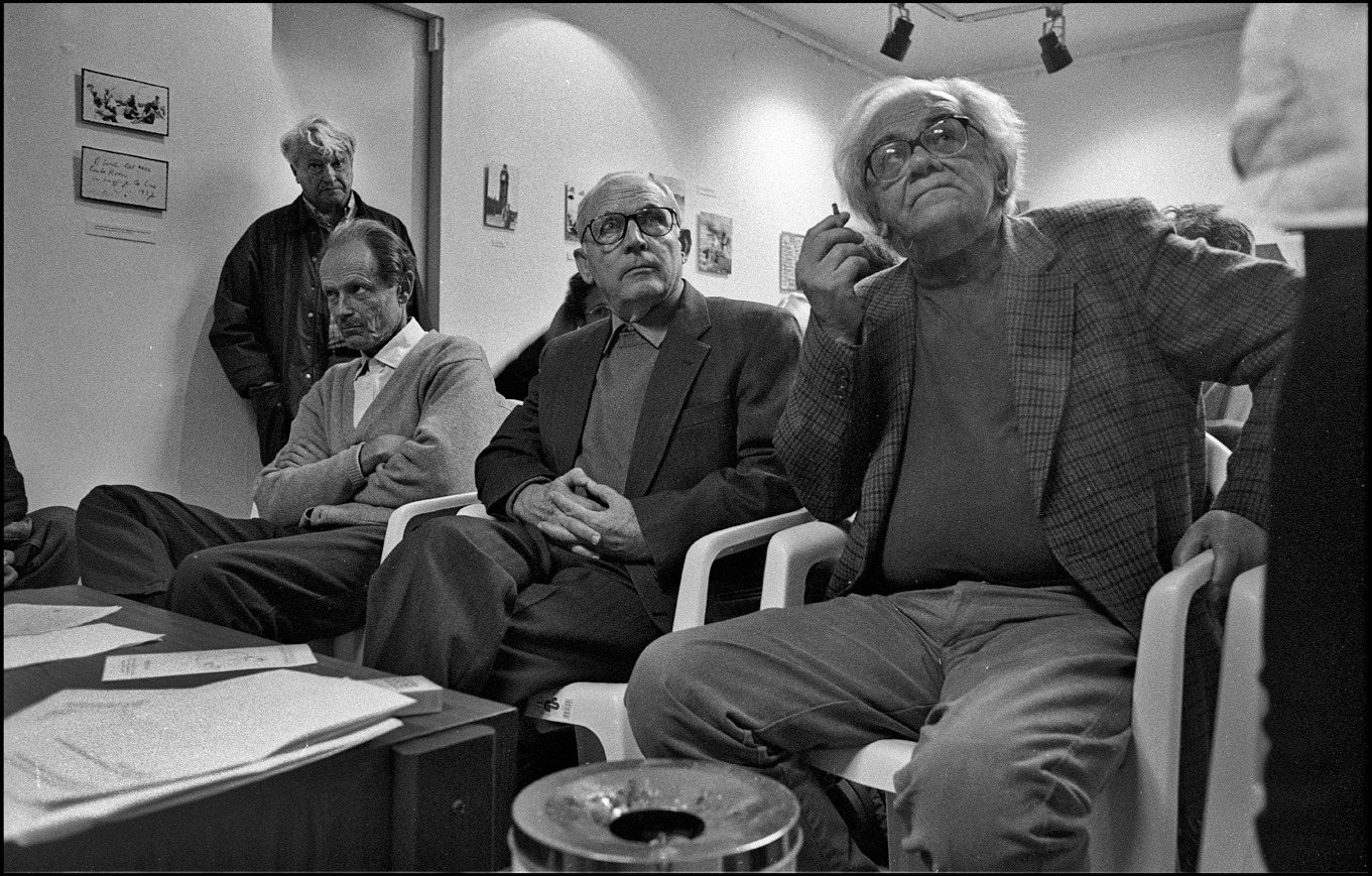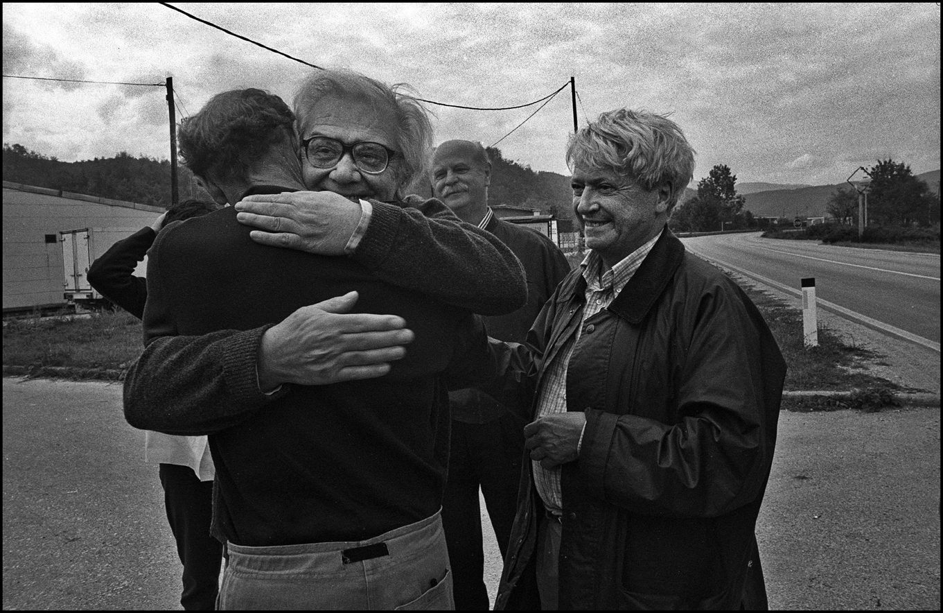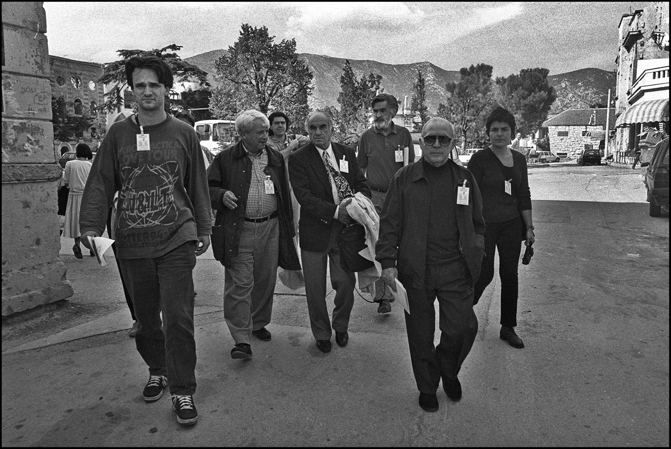 Le foto di questa galleria sono state scattate soprattutto durante un viaggio avvenuto nell’ottobre 1997, in autobus da Roma verso Mostar e Sarajevo. "Un autobus carico di poeti e scrittori, tre fotografi e qualche giornalista (…) organizzato dal Fondo Alberto Moravia, grazie alla tenacia di Toni Maraini", ha raccontato Mario Boccia in un suo articolo per OBCT nel 2011. "Se guardo le foto scattate in quei giorni, le ritrovo piene di abbracci, sorrisi, alcool e sigarette", narra Boccia, "Ci sono amici che non si vedevano da anni, altri che avevano passato le linee del fronte per farlo, magari portando convogli di aiuti umanitari, come Erri de Luca."