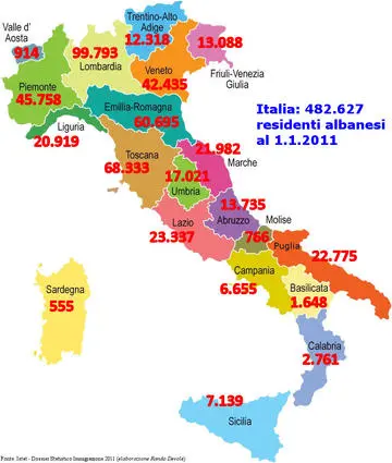 Come sono distribuiti territorialmente gli albanesi titolari di permesso di soggiorno? Al primo posto si ritrova Lombardia con 89.091 titolari. Seguono Toscana (64.215), Emilia Romagna (55.447) e Piemonte (41.153). Veneto e Lazio sono rispettivamente nelle quote di 38.777 e 19.673. All’ultimo posto c’è la Sardegna, dove solo 482 albanesi sono titolari di permesso di soggiorno. Comunque, non esiste questura in Italia che non abbia rilasciato almeno qualche decina di permessi di soggiorno a favore di cittadini albanesi. Perfino ad Oristano sono stati autorizzati 28 permessi di soggiorno per albanesi. Chieti detiene il primo posto per incidenza degli albanesi titolari di permesso (47,2% sul totale degli immigrati). A livello regionale è la Puglia al primo posto con il 33,8% di albanesi sul totale delle varie collettività straniere.