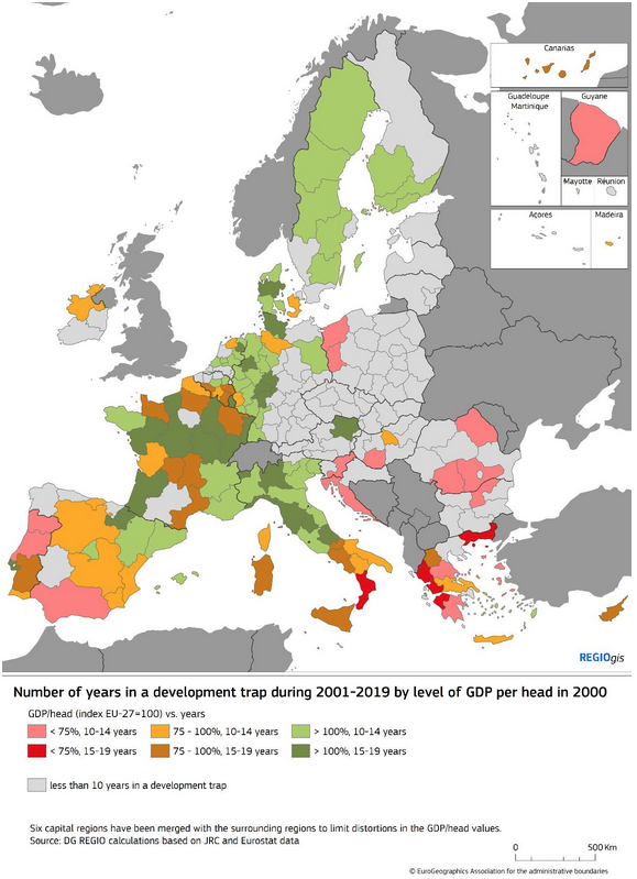 Quello che invece balza all’occhio, è – nello stesso arco temporale – la contrazione del PIL pro capite dell’Europa meridionale. Paesi come la Grecia e l’Italia mostrano di non essersi ancora ripresi a seguito della crisi economica del 2008. L’intera Grecia, l’Italia meridionale e alcune aree rurali o ex industriali della Francia sono cadute nella trappola dello sviluppo nonostante il sostegno ricevuto dalle politiche di coesione e un iniziale vantaggio competitivo. La maglia nera spetta a ben quattro regioni greche (rispettivamente Dytiki Ellada, Ipeiros, Thraki e Analotiki Makedonia) e una italiana (Calabria), dove il PIL pro capite da più di 15 anni è inferiore al 75% della media europea (mappa 2).