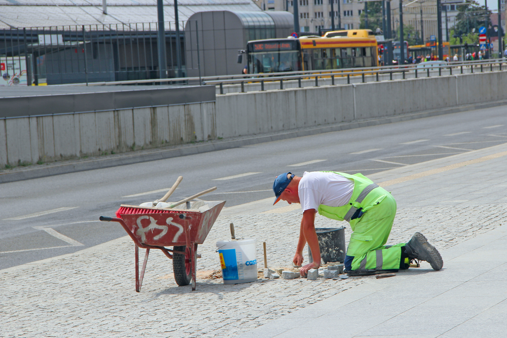 Un lavoratore intento a riparare un marciapiede in Polonia (© alexmak7/Shutterstock)