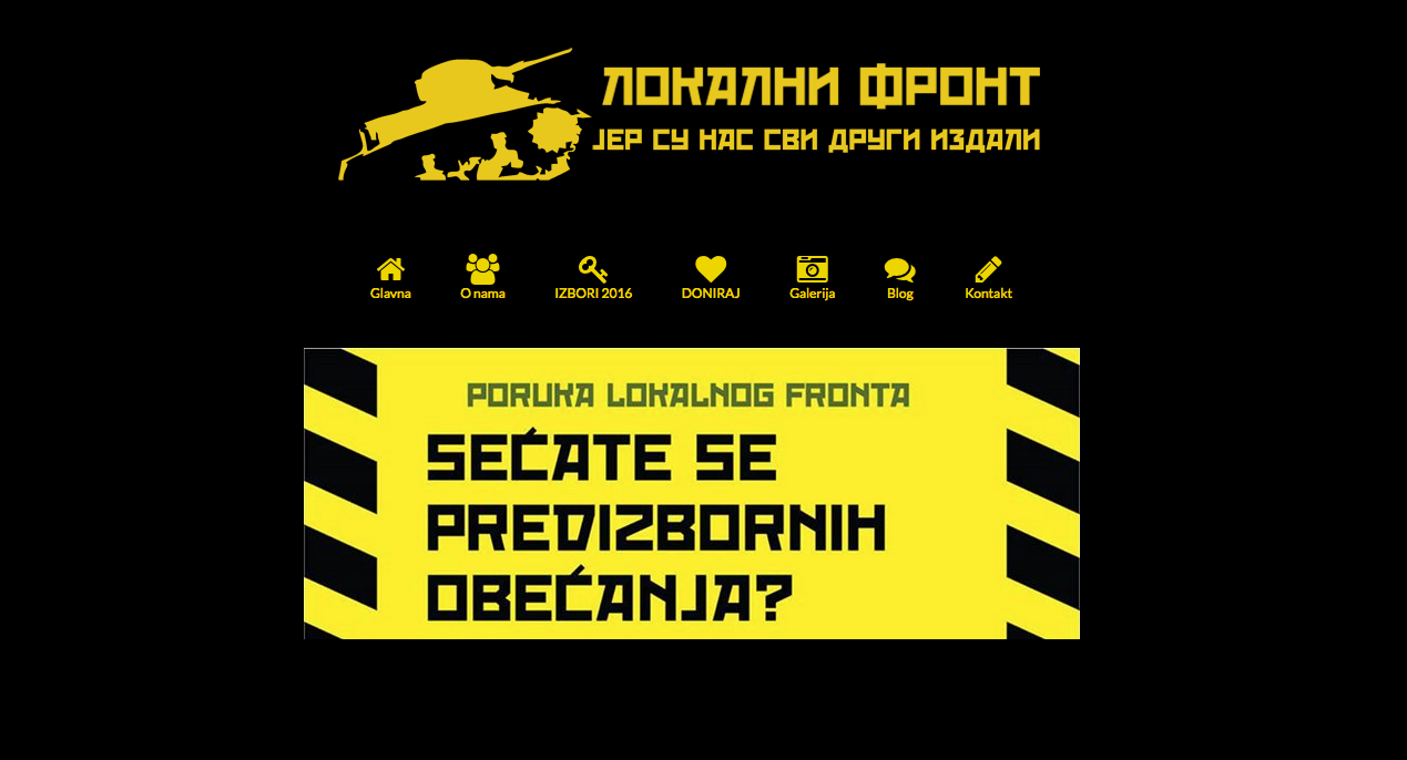 La storia del Lokalni Front è iniziata in modo modesto dalla denuncia sui social network di misfatti della politica locale e da post che denunciavano la grave situazione economica del paese. Per i 110.000 abitanti della regione di Kraljevo, il principale datore di lavoro è l’ospedale. 20.000 persone ricevono uno stipendio dal settore pubblico e solo 5.000 sono impiegate nel settore privato, sapendo che in cinque anni il 70% dei posti di lavoro privati è andato perso. Gli attivisti hanno organizzato incontri, dimostrazioni ed hanno accusato apertamente "Zelja" uno dei capi dei clan di Kosovska Mitrovica, di essere divenuto il vero e proprio “padrone” del comune di Kraljevo, che ospita circa 20.000 serbi sfollati dal Kosovo.