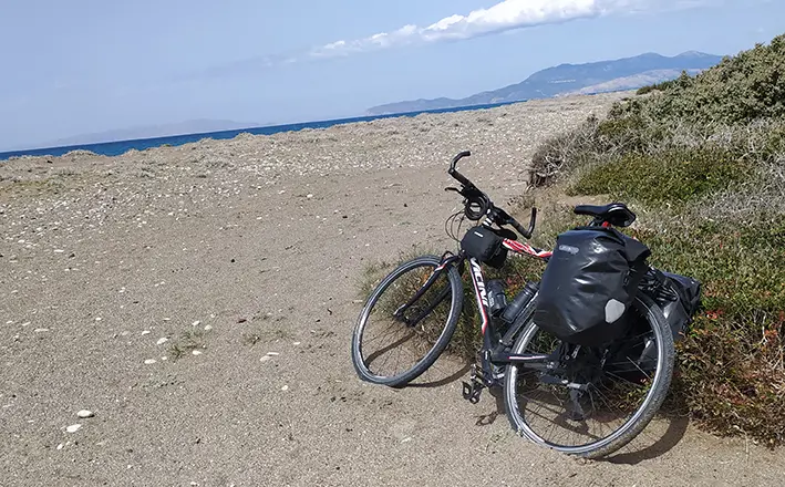 Ieri 100 chilometri, oggi 80 previsti, ma un po’ più ripidi visto che il navigatore mi dice che saranno almeno ottocento metri di dislivello. Inoltre oggi avrò una decina di chilogrammi in più, perché porterò con me i bagagli, visto che mi trasferirò sulla costa nord, per ritornare poi a Rodi lungo la strada costiera. Il mio ferreo corsier, che anche la notte scorsa ha riposato in camera con me al fianco del letto, è pronto per portarmi lontano. Bicicletta! riservata, veloce, trasparente, un movimento d’aria, parafrasando Pablo Neruda che ne scrisse un’ode nel 1956.