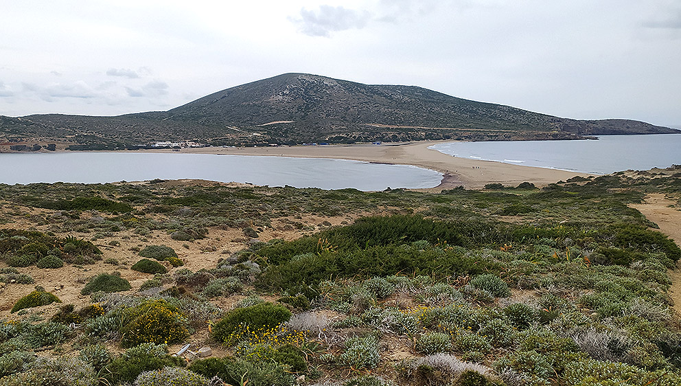 Al mattino pedalo sulla strada costiera in direzione sud, sotto un cielo grigio e basso. Qualche goccia d’acqua e refoli marini. I primi venti chilometri sono un susseguirsi di cantieri aperti e di conseguenza c’è traffico di camioncini e pickup ad uso edile. Ville e villette, palazzi e palazzine, più o meno distanziate, più o meno completate. Perché superato Akra Lindos, un promontorio bello e selvaggio posto a sud del paese, la costa è bassa e sabbiosa, perciò appetibile turisticamente.