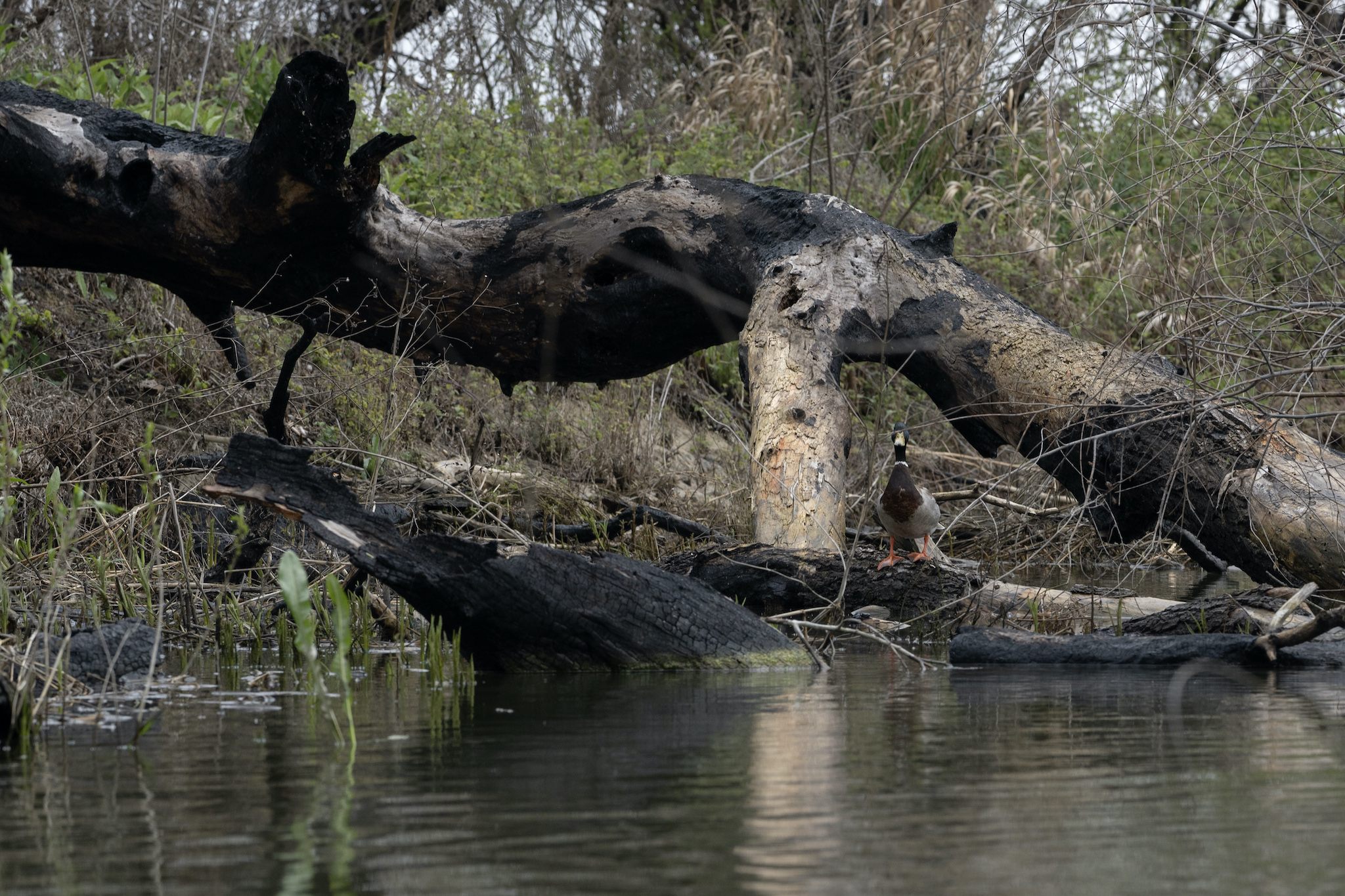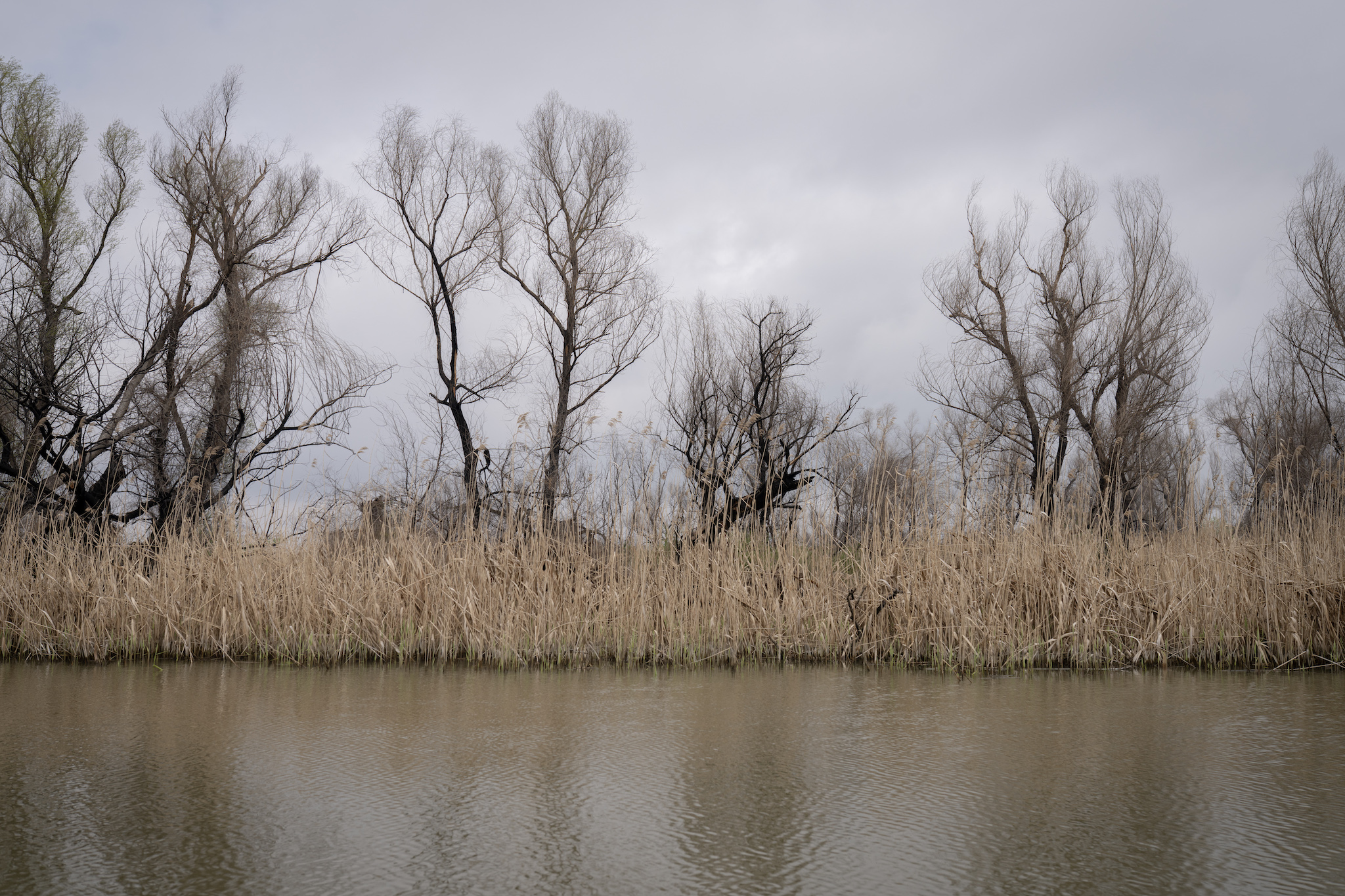 Ci porta a fare un giro in acqua con la sua barca. Ci dirigiamo verso il canale Olguța, dove un anno fa bruciavano le sterpaglie su entrambi i lati del fiume, e poi verso il lago di Fortuna, una delle tante zone dove la pesca è legale. Raggiungendo il canale Olguța, vediamo i segni lasciati dall’incendio e il canneto che inizia a rigenerarsi. Non è così per gli alberi: i salici, carbonizzati dalle radici in su, non si sono ripresi. “Se dopo un anno non è spuntato nemmeno un piccolo germoglio verde da questi alberi, cosa ne sarà di loro? Non sono d’accordo con quello che fanno qui”, confessa Sorin.