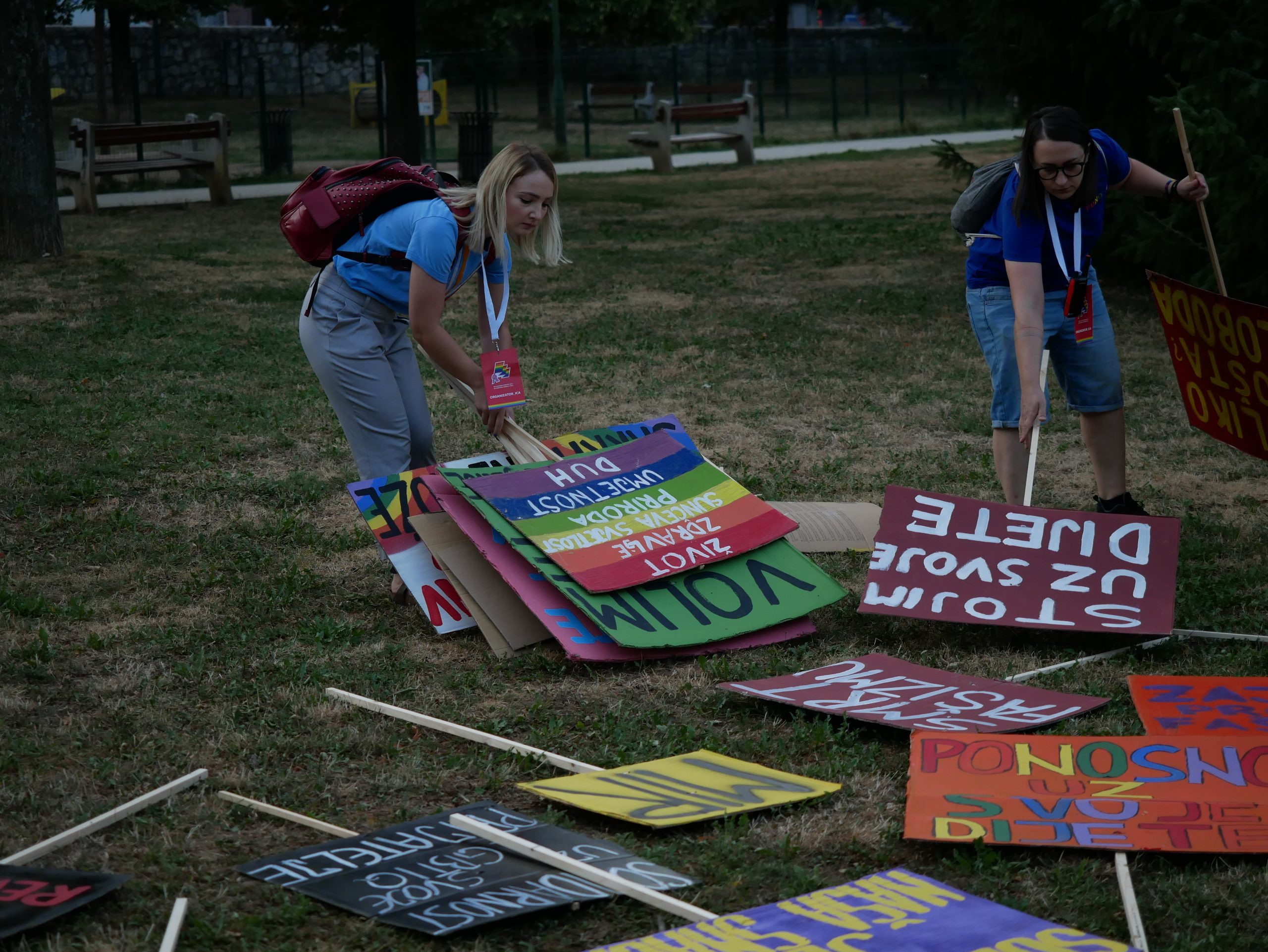 Per i controlli si attende brevemente davanti ai cancelli barricati del parco, si passa una persona alla volta, aprendo borse e zaini e mostrando la certificazione di vaccinazione o il tampone negativo. Passata la sicurezza si entra nel parco Safet Isović, accolti da attiviste e attivisti del pride che distribuiscono bandiere, cartelloni, spille e altro materiale.