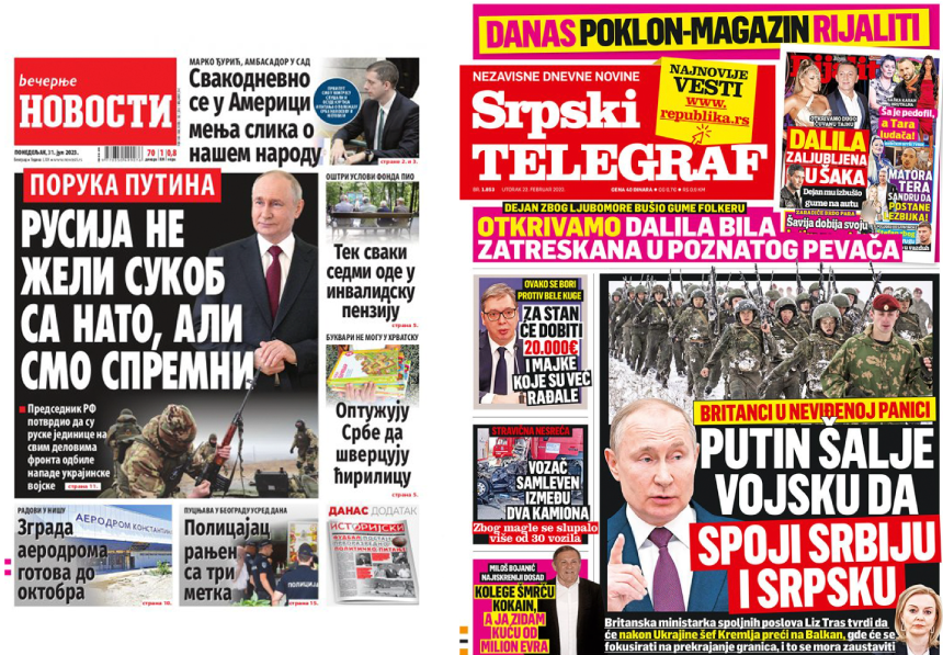 Alcuni giornali serbi sono talmente schierati a favore della Russia che spesso riprendono interi articoli dai media russi, ripubblicandoli senza alcuna revisione. L’anno scorso il quotidiano Večernje novosti ha riportato testualmente un articolo originariamente pubblicato da una testata russa, riferendosi all’esercito russo con l’espressione “il nostro esercito” e all’esercito ucraino con la parola “nemico”.