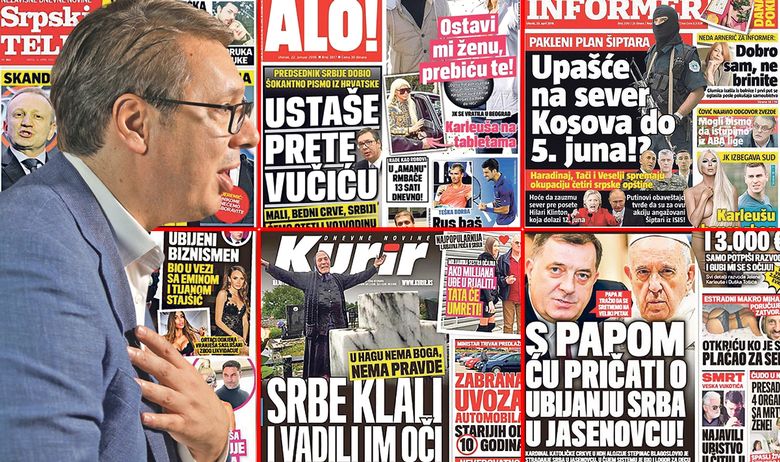 I tabloid serbi non si fanno scrupoli ad attaccare i presunti nemici della Serbia, esterni e interni, e a spaventare i cittadini annunciando nuove guerre e massacri, nonché la creazione di una coalizione anti-serba composta dai paesi vicini, alimentando continuamente un clima di odio e di tensione con titoli del tipo “Gli ustascia si sono rallegrati! I croati darebbero tutto per vedere Vučić perdere il potere! Ormai è chiaro anche a loro: non può esistere una Serbia forte senza Vučić”.