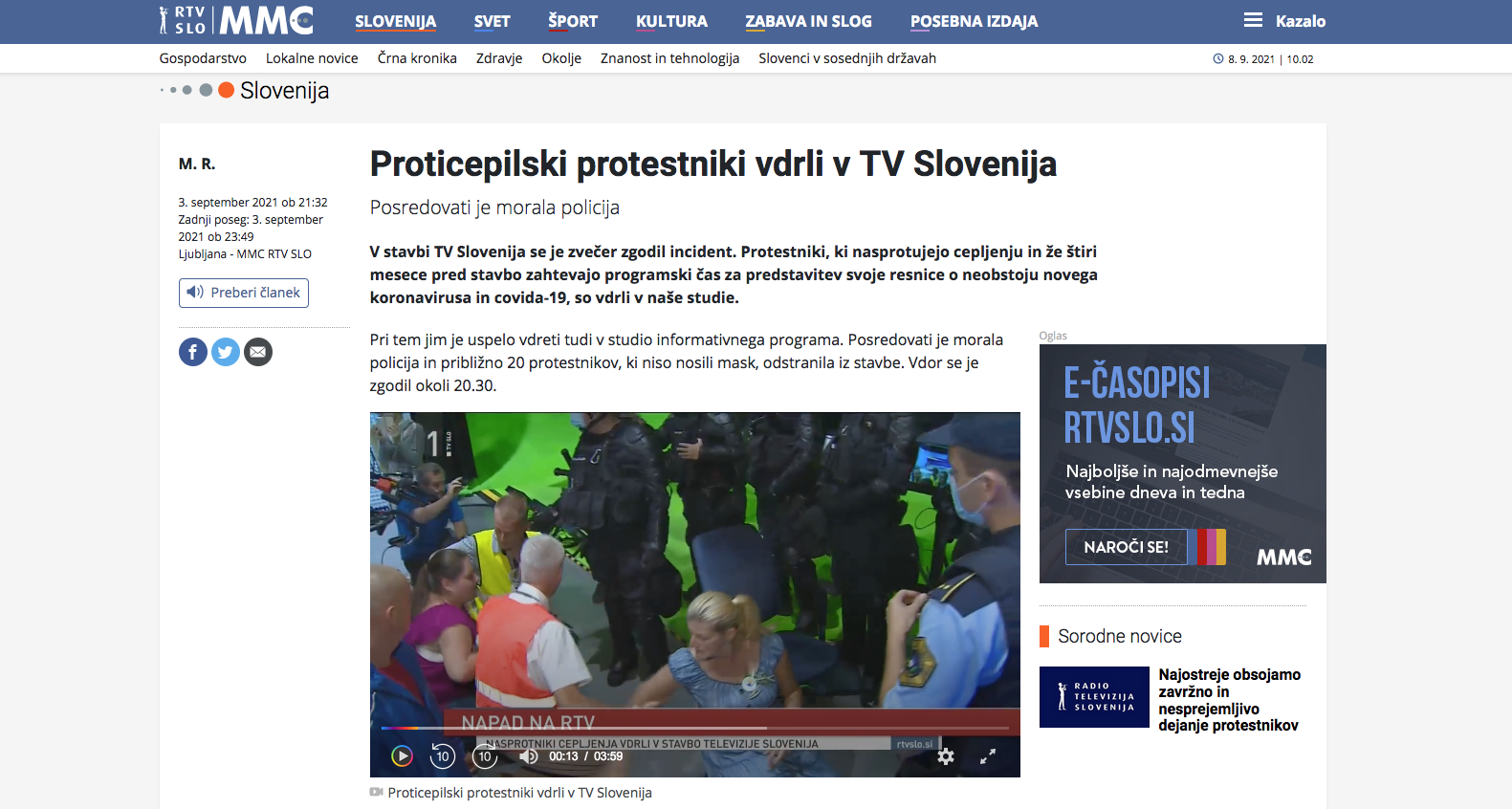 Il portale di RTV Slovenia pubblica la notizia dell'irruzione nei propri studi televisivi