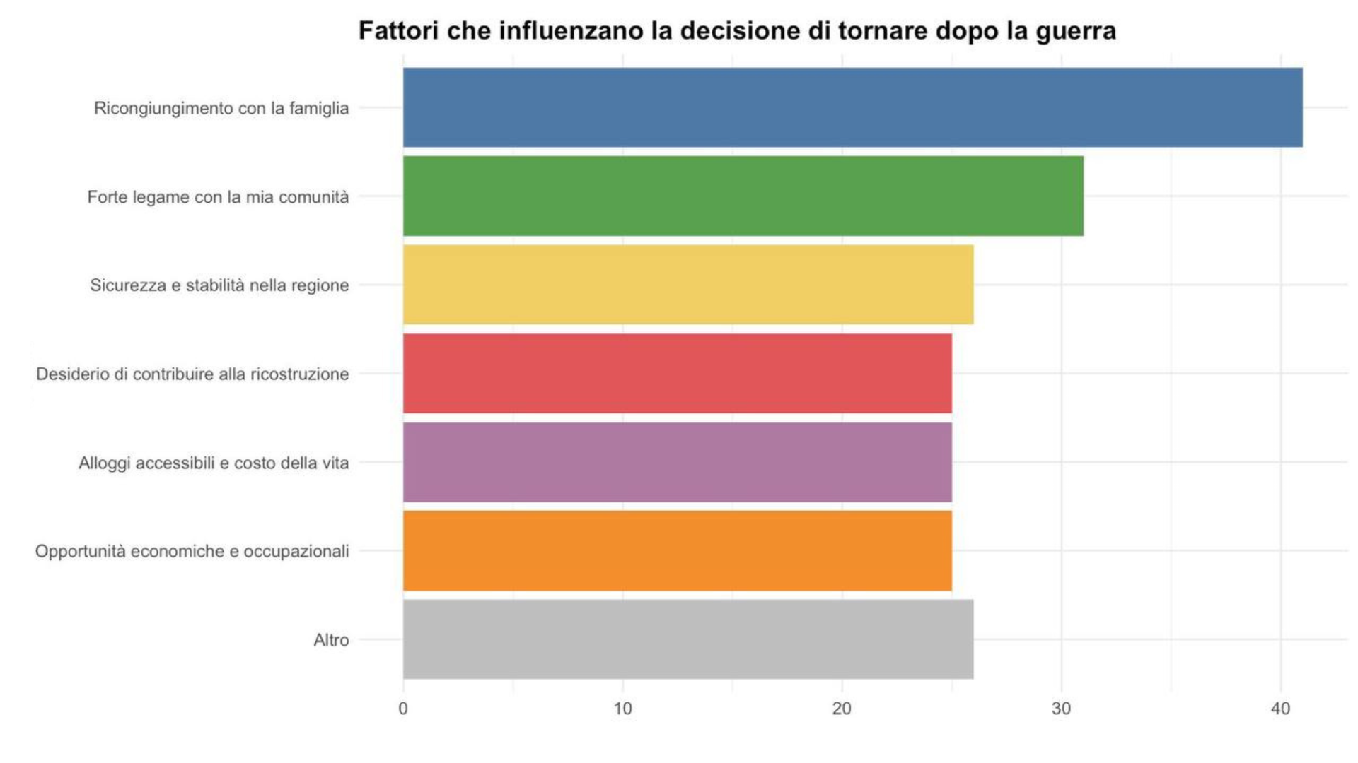 Fra gli altri fattori che influenzano la decisione di tornare ci sono barriere legali e amministrative, come le restrizioni militari e la cessazione della protezione temporanea, ma anche la discriminazione linguistica, l’impatto psicologico della guerra, l’integrazione e i legami sociali nei paesi ospitanti e l’assenza di una casa o di una rete di supporto a cui fare ritorno dopo la fine della guerra.
