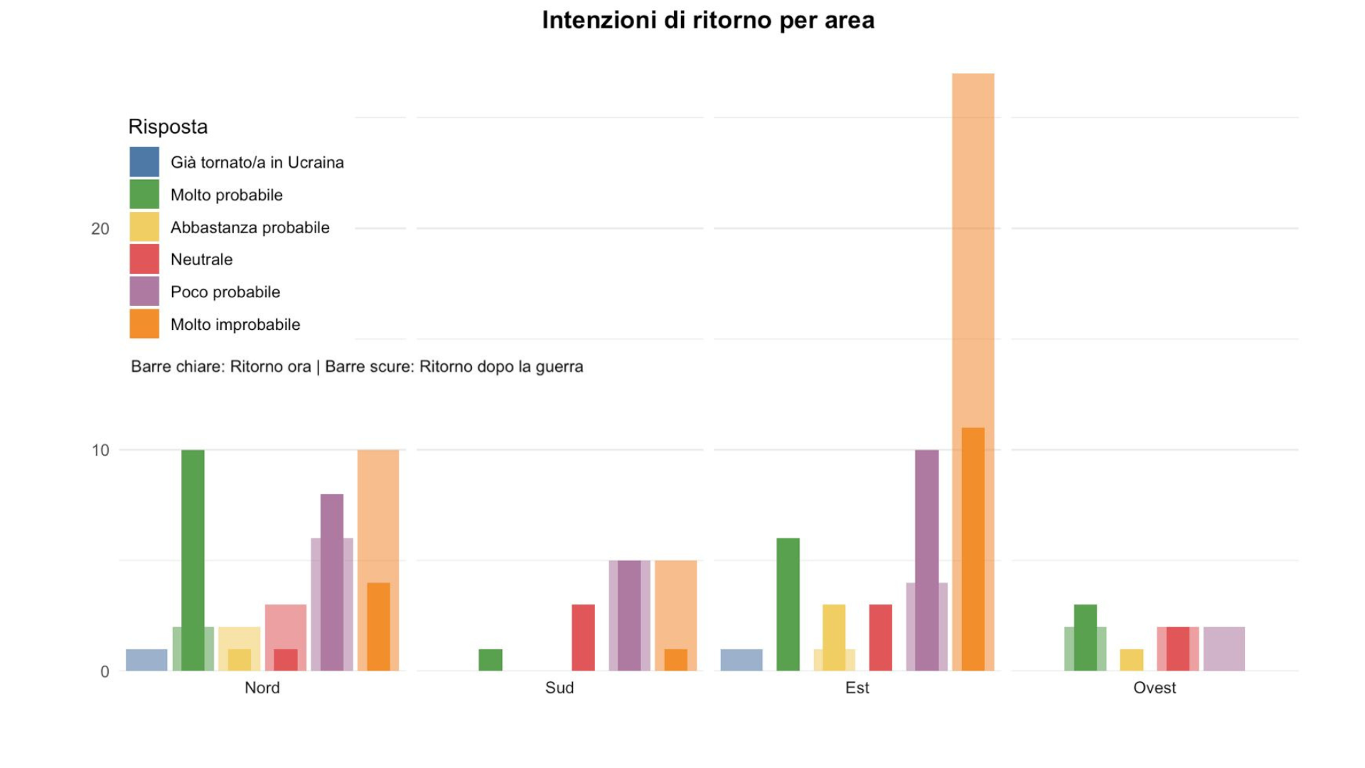 Sebbene il desiderio di tornare possa essere forte, i tempi e la probabilità variano significativamente a seconda della regione di origine. Le persone provenienti dall’est e dal sud dell’Ucraina hanno meno probabilità di tornare, soprattutto prima della fine della guerra. Queste regioni hanno subito alcuni dei combattimenti più intensi, occupazioni prolungate e distruzioni diffuse, rendendo l’idea del ritorno particolarmente difficile e incerta.