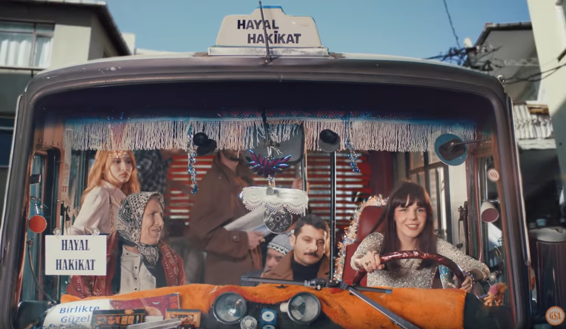 La tempistica per l’uscita del video “İstikrarlı Hayal Hakikattir” non è stata casuale. Gli elementi visivi e le tematiche dimostrano che Akyol ha dedicato la clip allo spirito dell’8 marzo. Con i suoi stivali alti di pelle rosa, la maglia luccicante e il mantello di velluto, Akyol sembra un incrocio tra una supereroina Marvel e un maestro jedi femminista. Quello che attrae è che sta guidando un minibüs, un mezzo di trasporto pubblico semi-ufficiale in Turchia simile ai matatu decorati del Kenya. I minibus viaggiano su rotte predeterminate, ma i passeggeri possono salire e scendere ovunque vogliano lungo la strada, cioè ovunque il “capitano” accetti di fermarsi. Seduto al volante come un piccolo dio, il tipico autista di minibus (il lavoro è esclusivamente per uomini) è famoso per la sua capacità di multitasking, spesso riuscendo simultaneamente a guidare, dare il resto, fumare una sigaretta e sgranare il rosario.