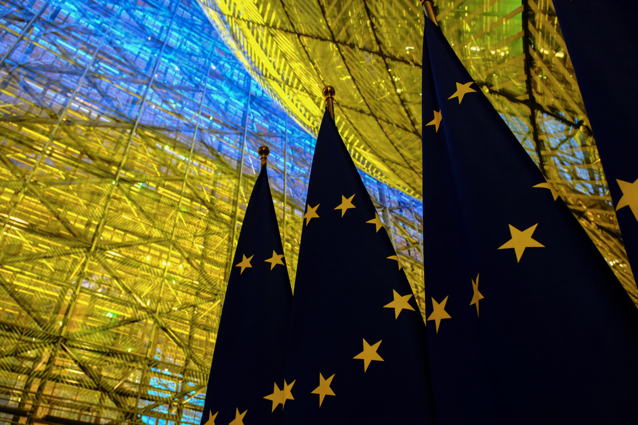 Bandiera ucraina con bandiere UE - Foto Consiglio UE