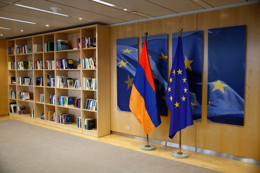 Le bandiere dell'Ue e dell'Armenia in un ufficio delle istituzioni europee a Buruxelles - © Alexandros Michailidis/Shutterstock