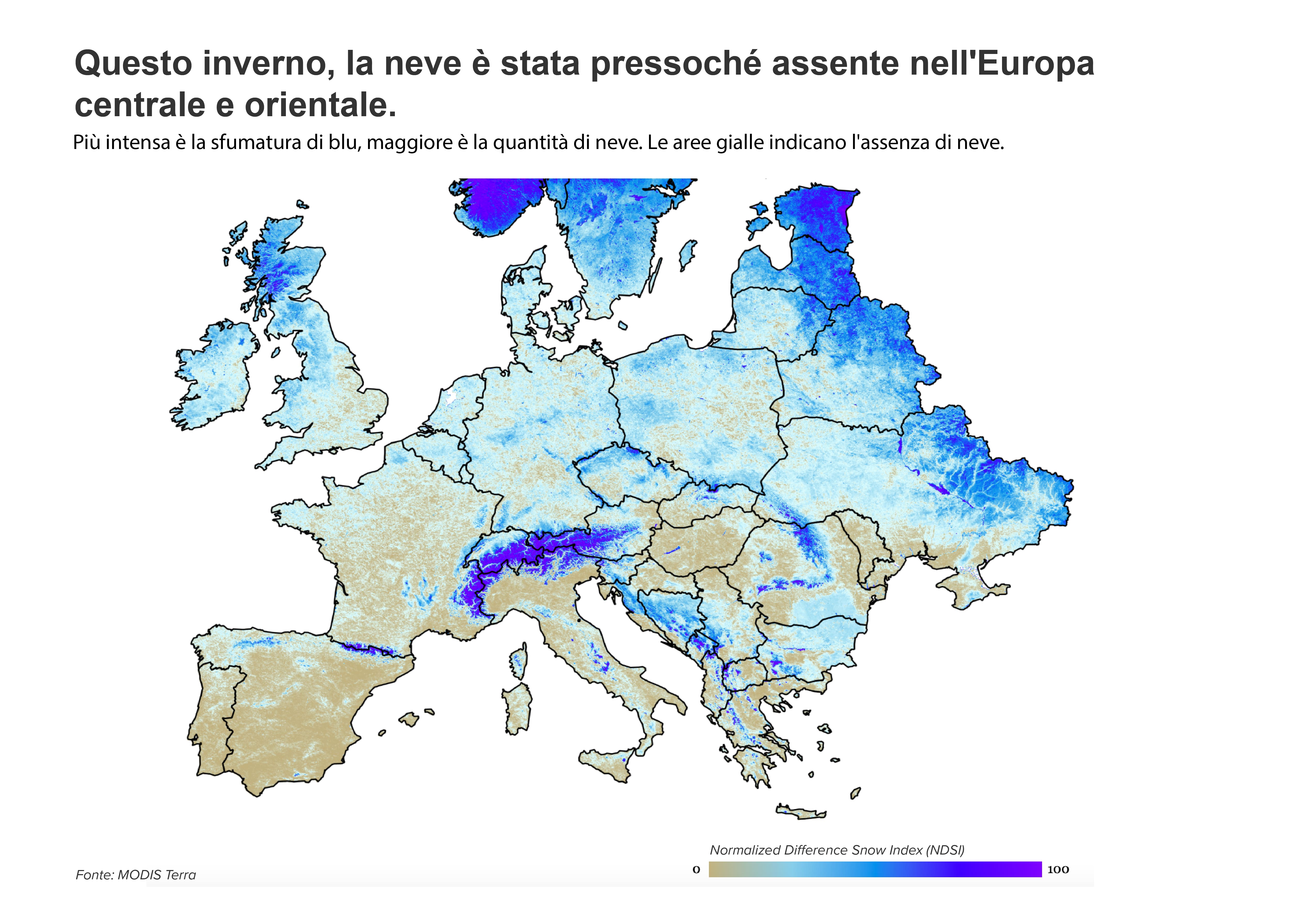 In Europa centrale questo inverno, secondo il centro di ricerca dell’Unione europea (JRC), la riduzione della neve ha causato un deficit idrico dal Baltico alla Bulgaria, con effetti negativi sulle coltivazioni. Inoltre, in queste regioni l’assenza di neve espone le piante alle gelate invernali, con il rischio di compromettere la resa agricola