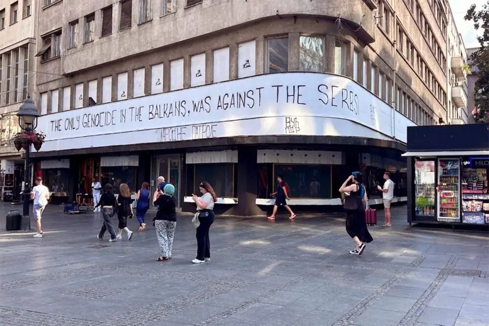 "The only genocide in the Balkans was against the Serbs": this graffiti appeared in the centre of Belgrade in June 2024, signed by a far-right organisation and has even been recently repainted. Photo: © Massimo Moratti